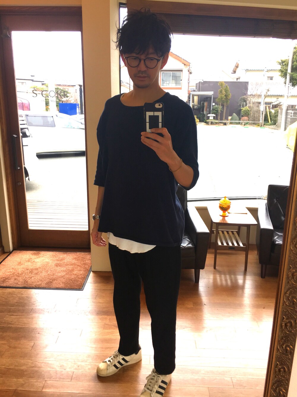 基本、おっさん美容師なので動きやすくて、あまりゴテゴテしないシンプルコーデです。トップスとパンツは季節感を出すためにウール素材。お店の中は暖かいので七分丈でも寒くないです(笑)