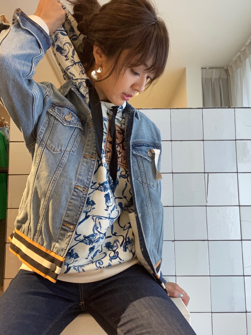濃紺のデニムに明るいデニムのジャケットを合わせた デニムオンデニムコーデ👖✨ VOGUEのイラストなどで活躍されている ブレアブレイテンコラボのパーカーで カジュアルかつ華やかに🥰