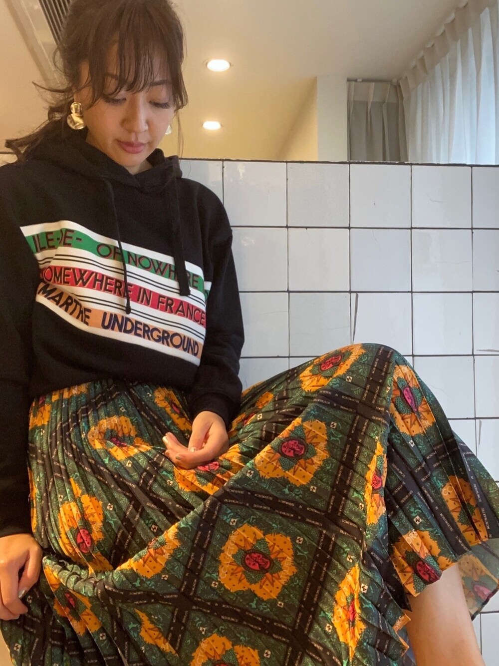 華やかな柄のプリーツスカートは パーカーを合わせてカジュアルダウン😊✨ グリーン、イエロー、レッドの3色で色味を統一💛💚❤️