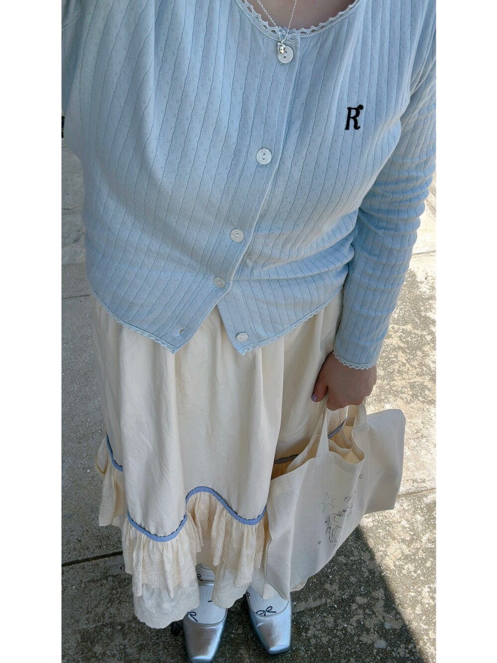 me.maのカーディガン/ボレロ「ロングスリーブカーディガン LIGHTBLUE」を使ったコーディネート