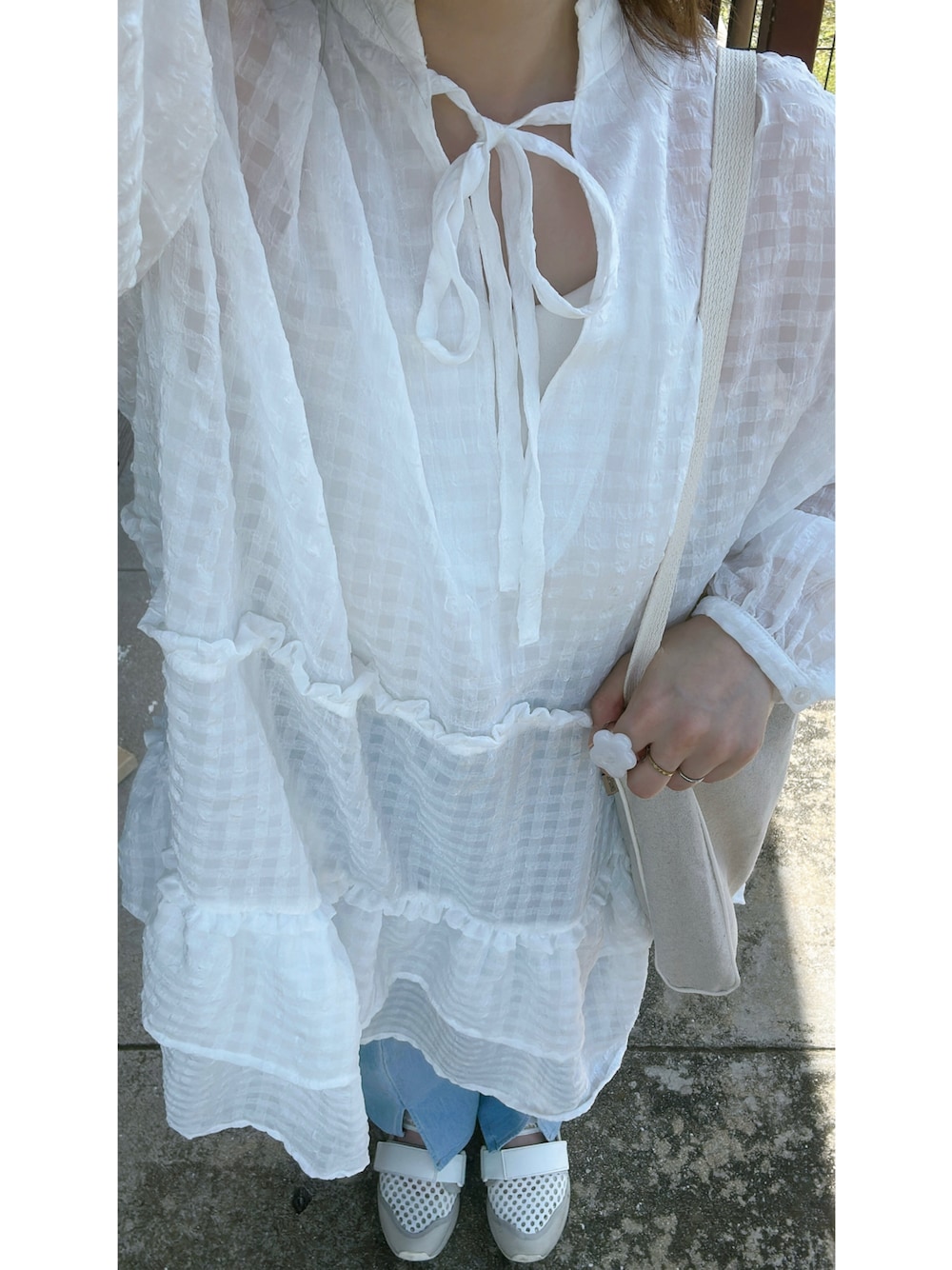 me.maのワンピース「シアーチェックワンピース OFFWHITE」を使ったコーディネート