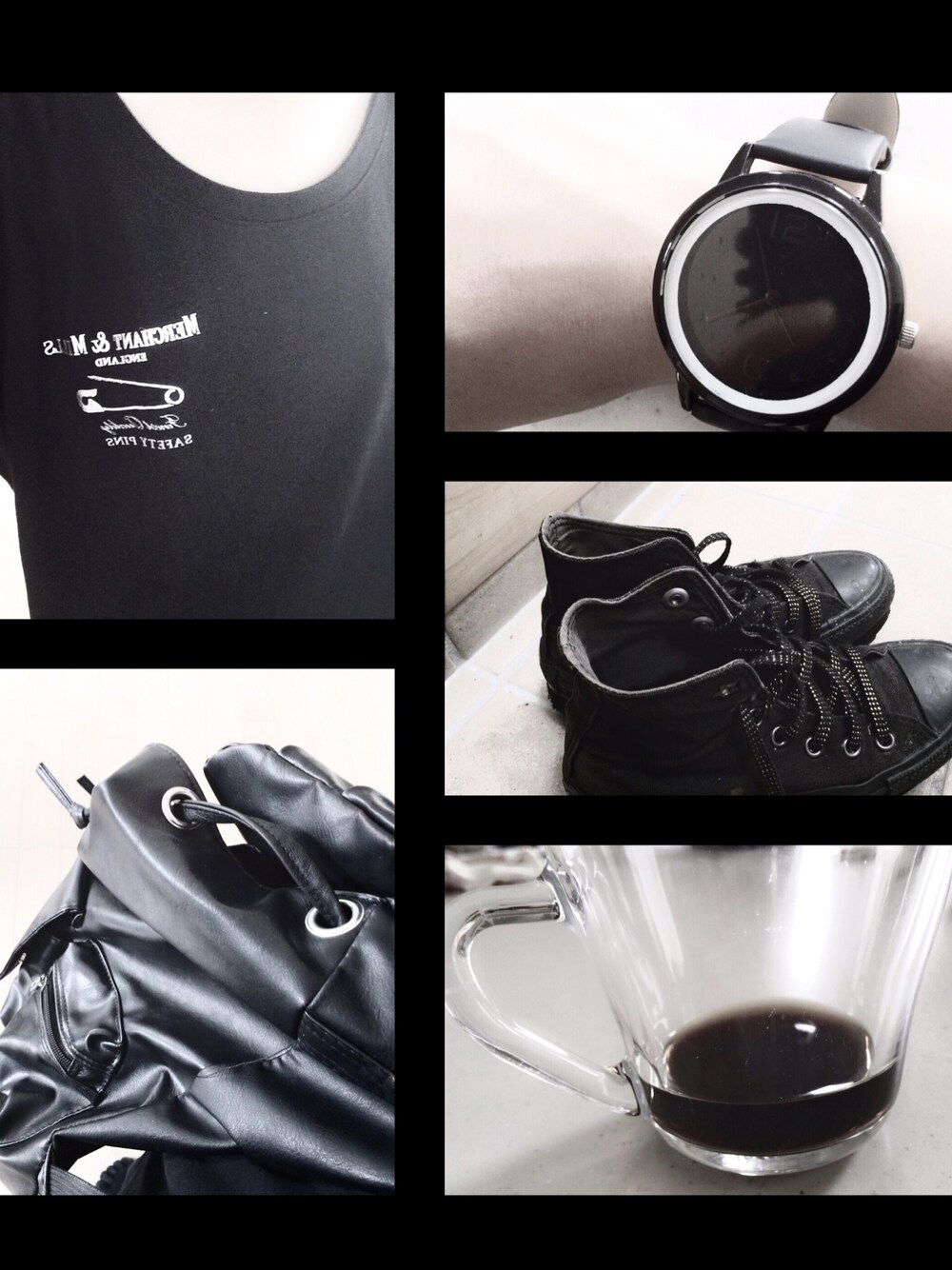 見事なオールブラック。 飲むものでさえコーヒーブラック