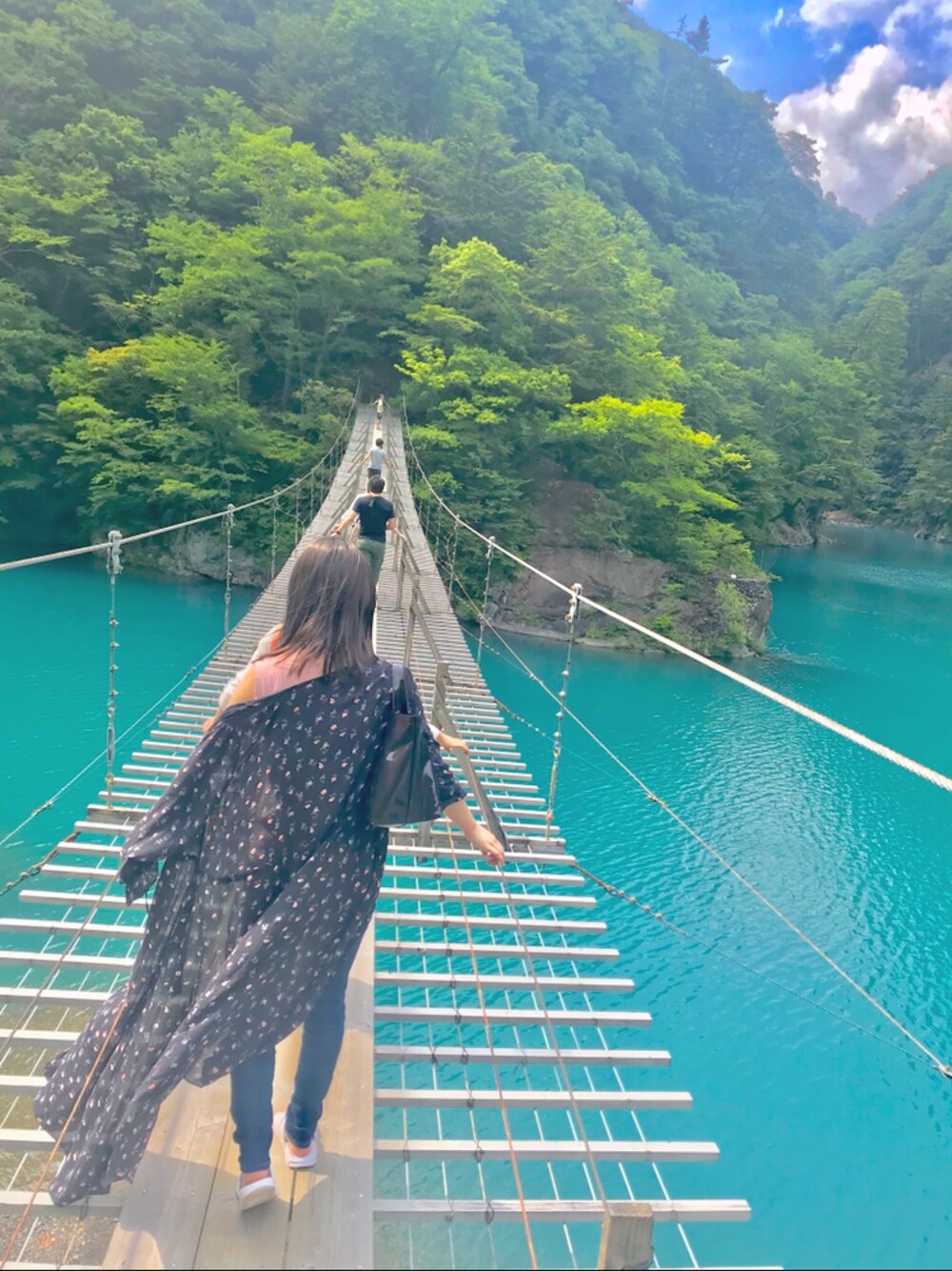 幼馴染と車で山をいくつも超えて寸又峡の夢の吊橋へ🌉✨ 雑誌で本田翼が着てて一目惚れして買っちゃったニコアンドのワンピをガウンがわりに羽織っていったけど、暑くって結局ジーユーのノースリーブで歩いた笑