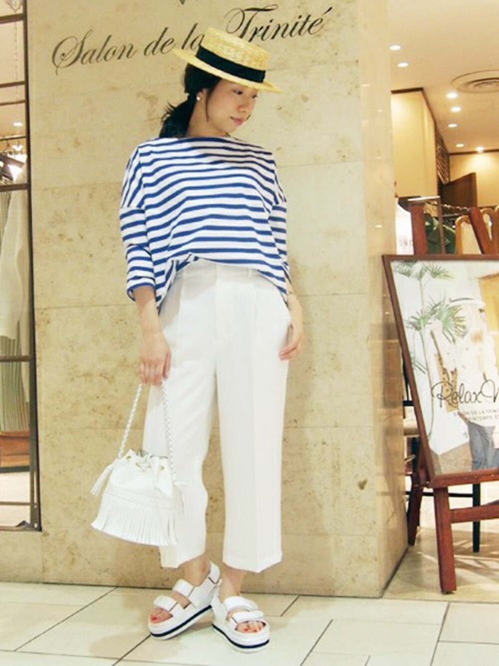 リラックスしたマリンルックは、小物でワンランク上のスタイリングにブラッシュアップ! J&M Davidsonのフリンジバッグは今年注目のアイテムです♪ 足元はOSHIMAREIのベッドフットでラフにまとめてみました!