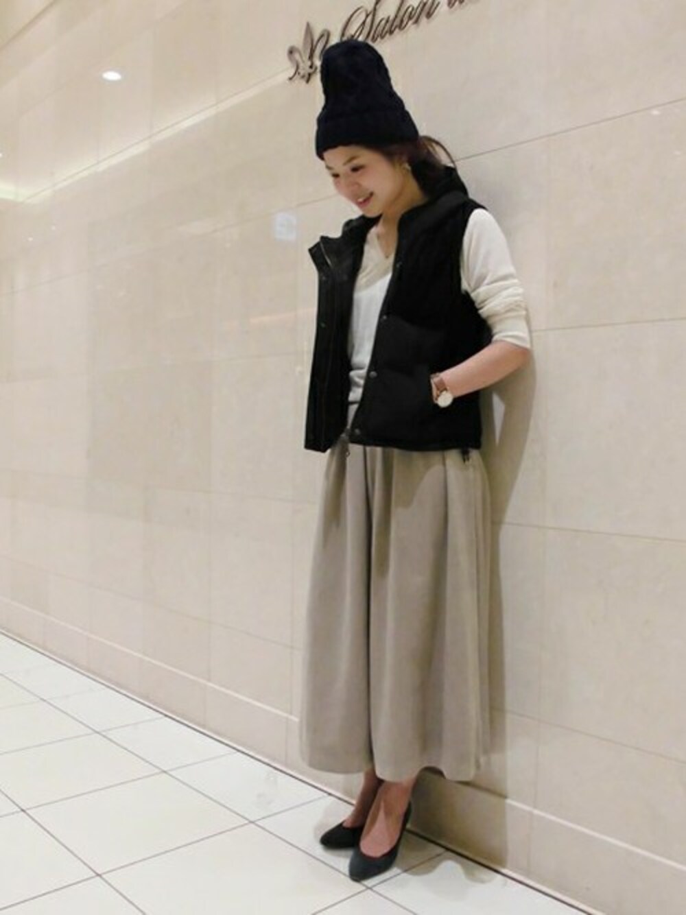 着用コーデ:2件ニットとの切り替えがポイントのベスト! 女性らしいシルエットのガウチョパンツにヒールを合わせて大人な印象に。