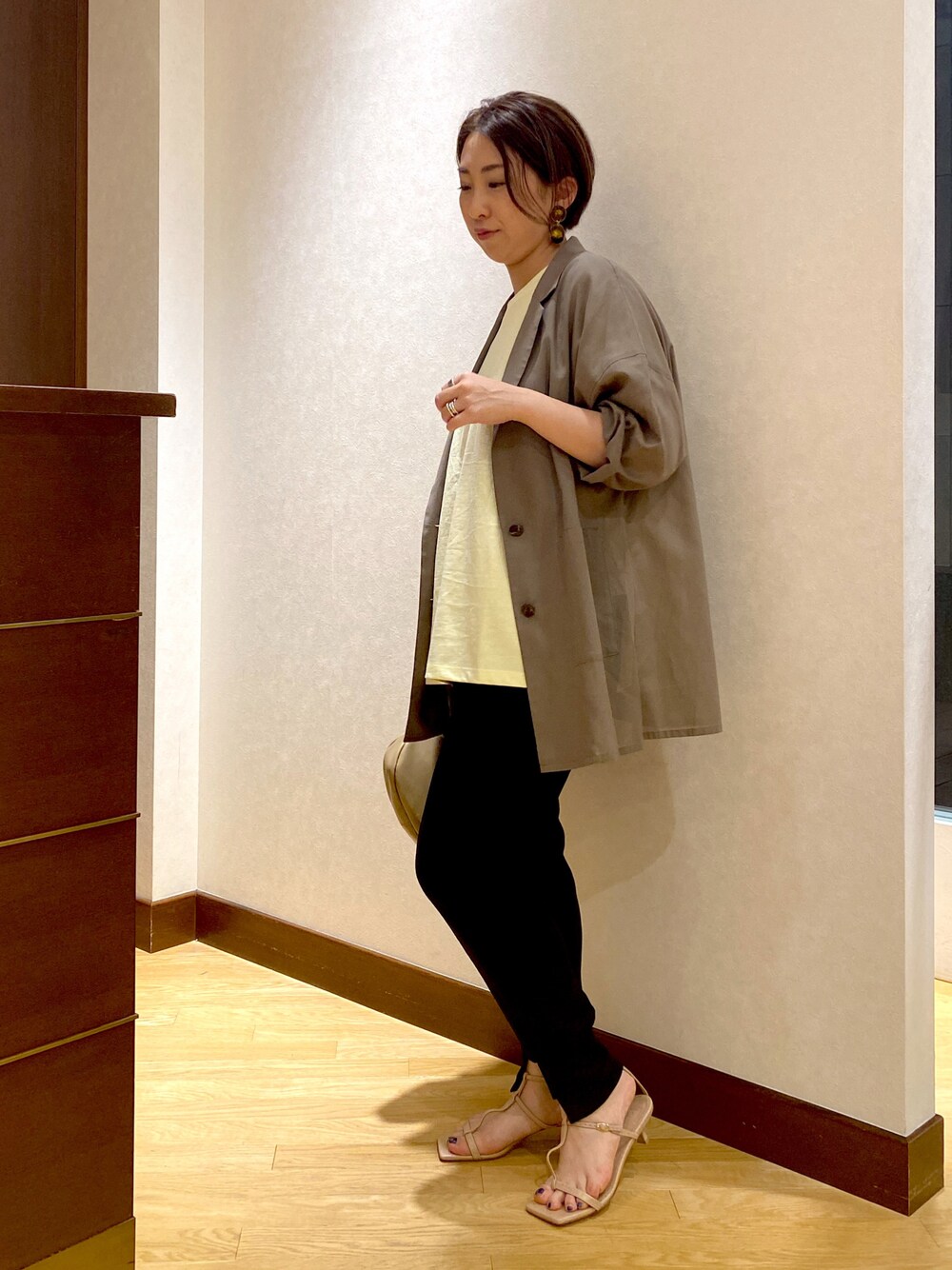 コットン素材の軽いジャケットをラフに羽織ったコーディネート。 Tシャツに合わせてもきちんと感が出るのでおすすめです!