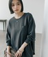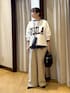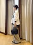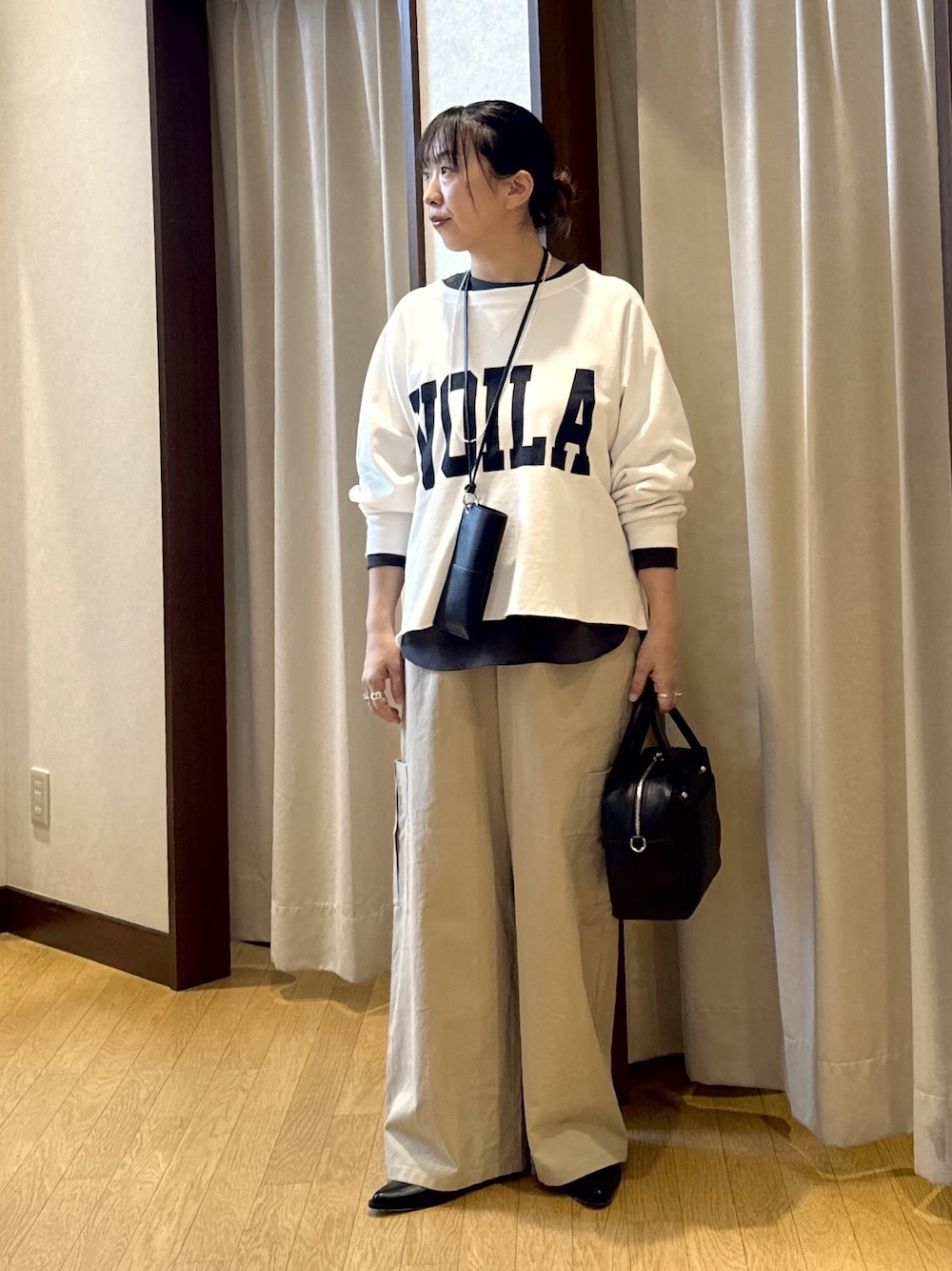 ワイドロゴスウェットに、ジョーゼットポケットブラウスのPMサイズを重ねています。 PMサイズのブラウスは着丈が5cm短くなり、低身長さんにもスッキリと着ていただきやすくなりました。 ワイドシルエットのボトムと合わせるのに、丈が短いおかげでウエストをインしなくてもバランスよく合わせていただけます。