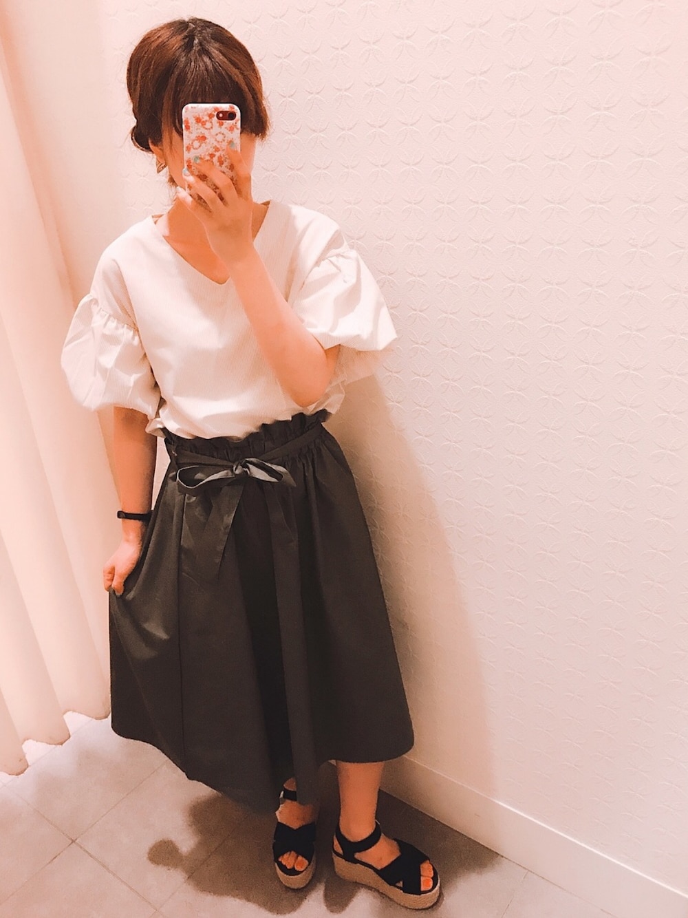 ベージュ×カーキ この組み合わせ私的好みです♡ バルーン袖とハイウエストスカートのリボンは今年っぽいスタイルに仕上げてくれます❤️