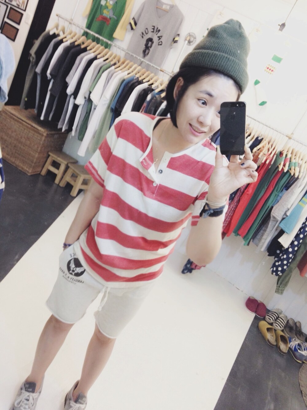 워싱처리로 톤다운 시킨 빈티지한 레드색상의 헨리넥티에 디테일이 좋은 면반바지
