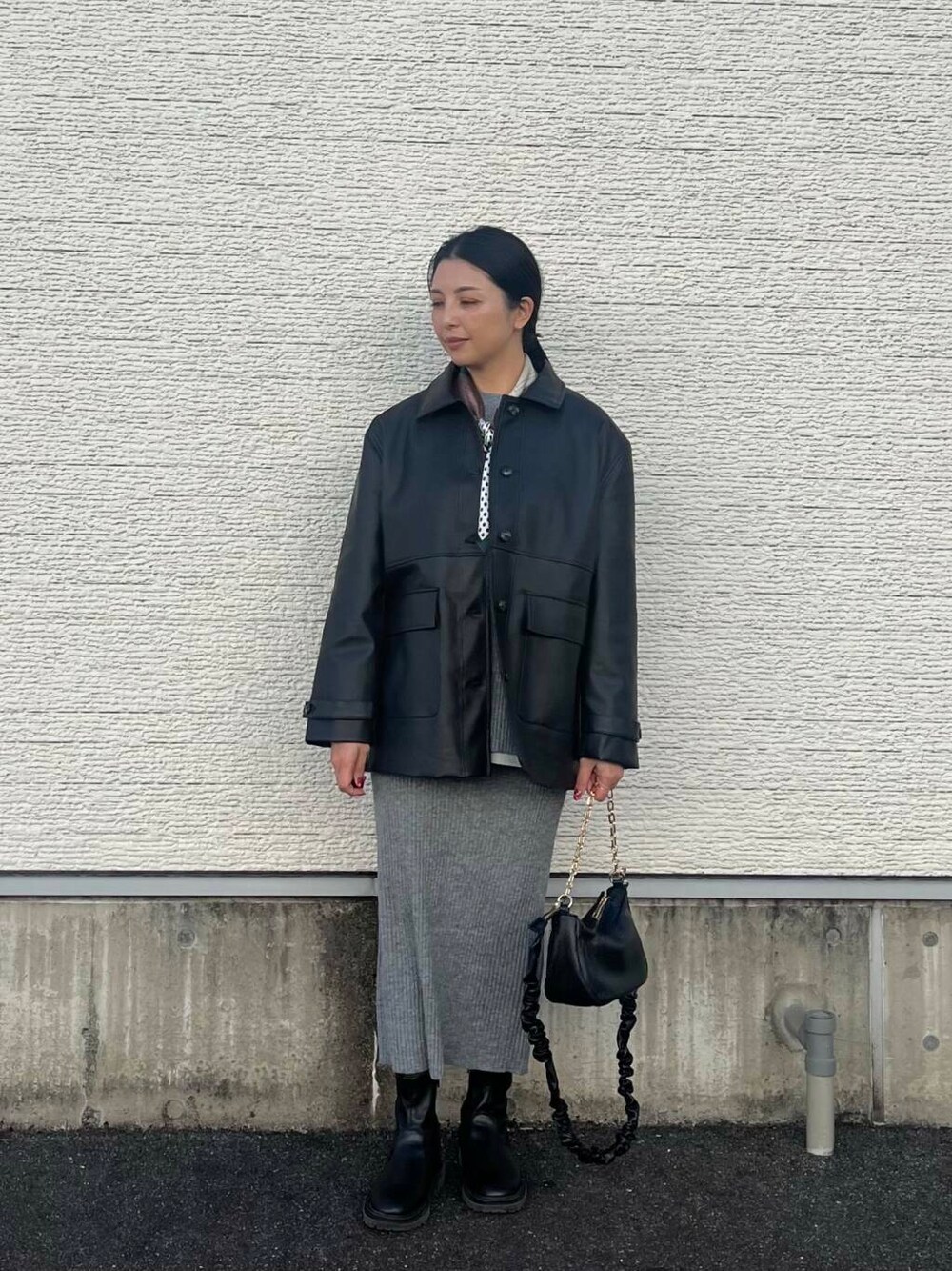フェイクレザーのジャケットはシンプルな デザインながらも存在感があり コーデのポイントに◎ リブニットのトップス×スカートは 程よい厚みで柔らかく着心地がいいです。 トップスは丈が長めなので気になる腰回りも カバーしてくれます。 テロンとしたブラウスをレイヤードして アクセントに。