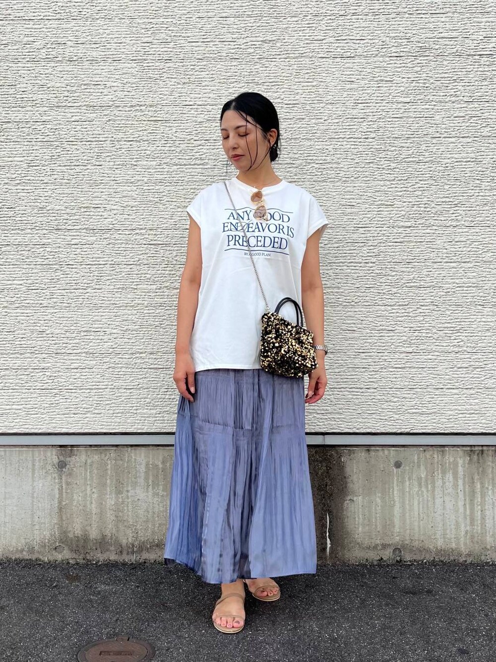 はやし(warehouse 土岐プレミアムアウトレット)のショルダーバッグ「チェーン付きスパンコールバッグ」を使ったコーディネート