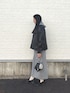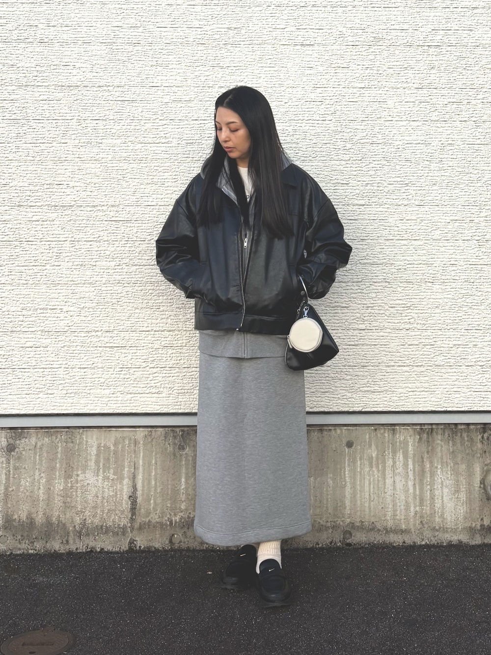 フェイクレザーブルゾンでコーデを引き締めつつ、ダンボールニット素材のパーカーとスカートでやわらかく軽やかな着心地に。異素材のバランスで、楽なのにきちんと見える大人コーデです。