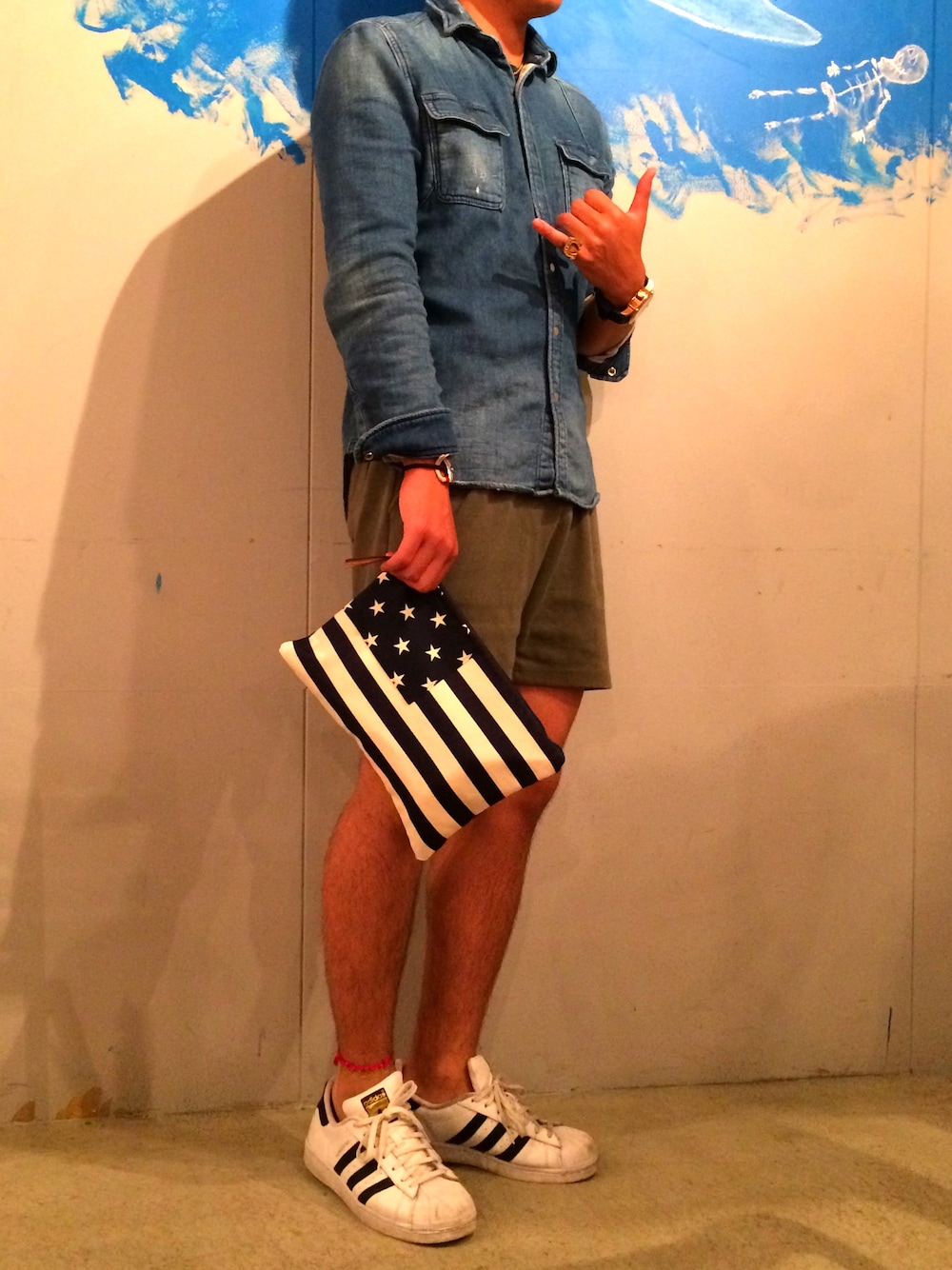 ALOHA🏄 . 夜はまだ少し肌寒く デニムシャツに救われました😭 着回しできるアイテムなので オススメです🕶 クラッチバッグはハンドメイド商品を 購入しました🇺🇸 是非followしてください🏝💓