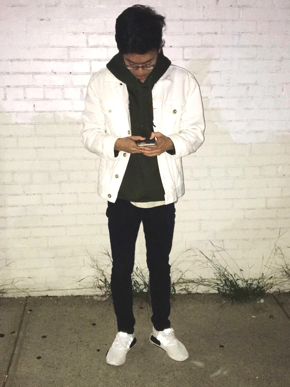 Street wear: olive hoodie paired with adidas nmds and white denim jacket