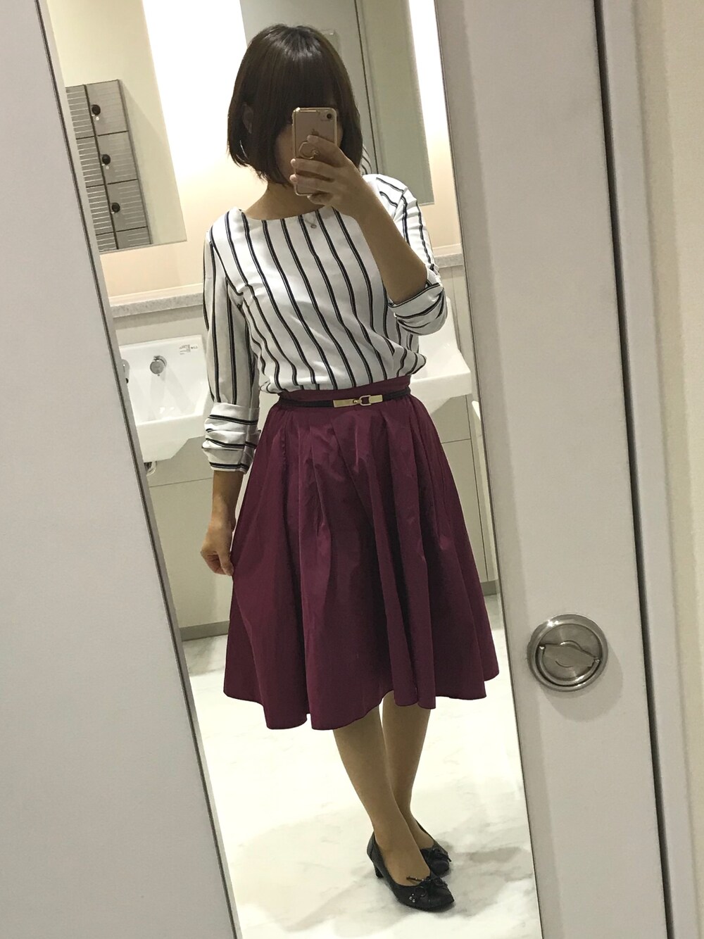 なぎのシャツ/ブラウス「袖りぼん付きストライプ柄ブラウス」を使ったコーディネート