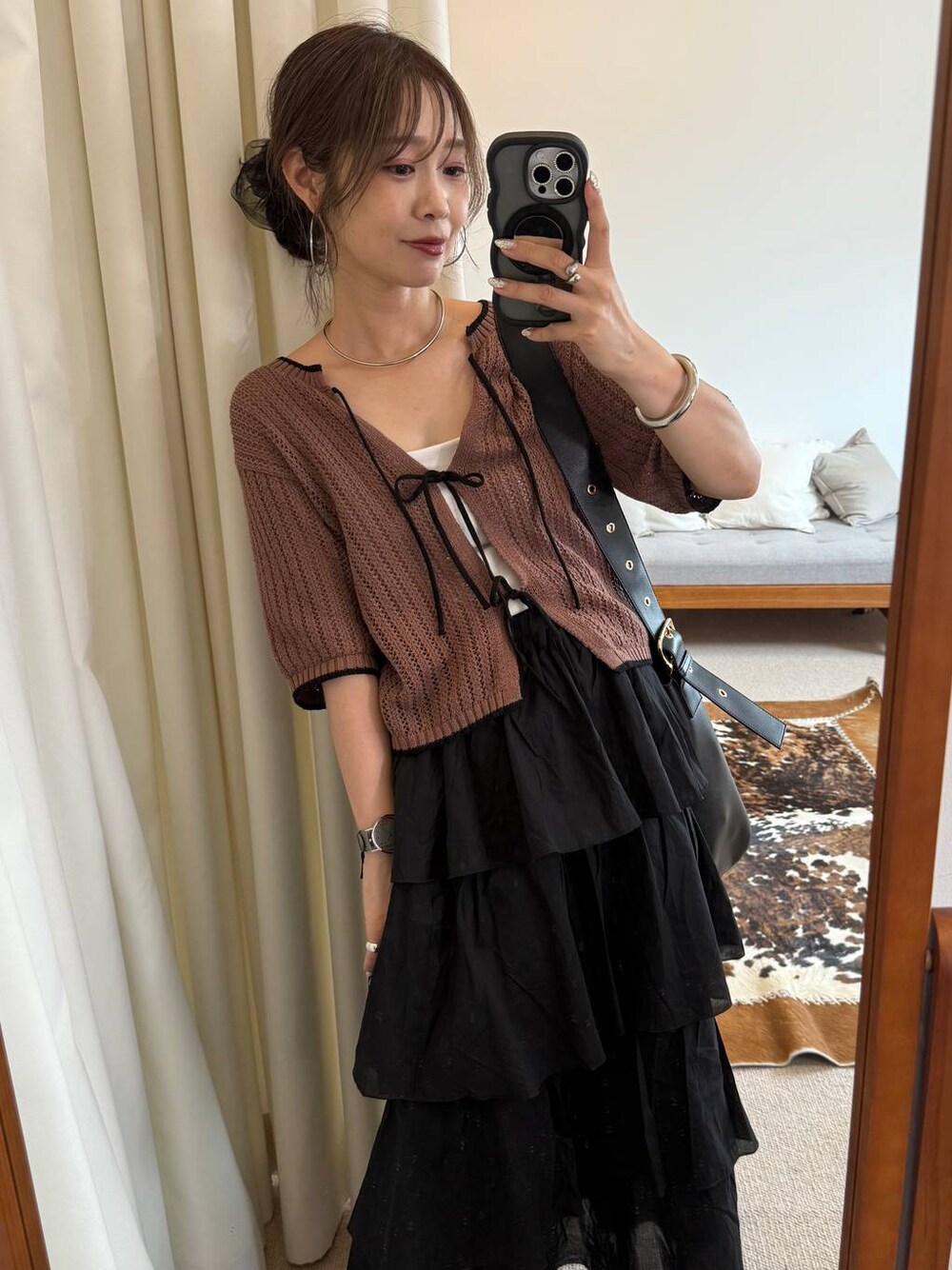 ▼使用アイテムは下からチェック出来ます▼ Instagramも毎日投稿中!質問・相談何でもどうぞ♡ 東京出張コーデ♡ リボンカーディガンにフリフリスカートを合わせてフェミニンコーデにしました(^^) トップスは透かし編みで軽やか!ブラウンと黒の配色が可愛くて一目惚れでした♡ スカートはボリュームはあるけど軽やかな素材で履きやすい! 出張にかなり使えるバッグ‼︎大量に荷物が入って、でもオシャレでお気に入り♡ 【着用サイズ】 カーディガン→フリーサイズ ピタっとせず着やすいです! 前後2WAYで使えるのも嬉しい! 二の腕も隠れて安心! スカート→Mサイズ ウエストはゴムなので楽ちんです! サラッと軽い素材で夏も暑くないです! 春夏秋いけそう!