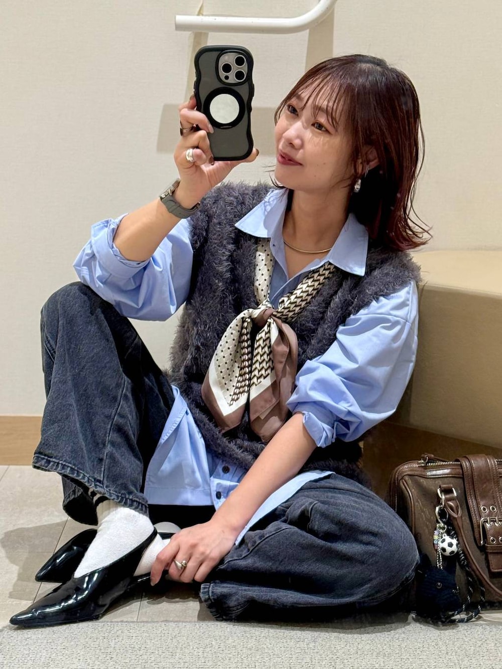 ▼詳しいサイズ感や着心地も記載しています▼ 出勤コーデ♡ シャギーベストにシャツを合わせて大人カジュアルコーデにしました(^^) このベストは肩が落ちないデザインなのでモケモケだけどスッキリ見えます!ふわふわ感もしっかりで、とても柔らかくてずっと触っていたい手触りです! ブルーのシャツ合わせだと大人っぽく爽やかに!スカーフを巻いてアクセントに! あえてかっちりしないようにブラックデニムで抜け感を出しました! 【着用サイズ】 ベストセット→Mサイズ ゆったりしています! 肩は落ちないデザインなのでスッキリ見えます! ふわふわ感強めですが柔らかくて肌触り◎ シャツ→Lサイズ ゆとりがありますが、オーバーサイズで着たかったのでLサイズを選びました! 皺になりにくいのでお手入れ楽ちんです! デニム→Mサイズ ゆったり太めで履きたかったのでMサイズを選びました! ウエストにゴムやタックのないデザインなのでスッキリ綺麗に見えます! サイドのステッチが斜めに入っていてオシャレに見えます! 太めのシルエットでトレンド感も◎