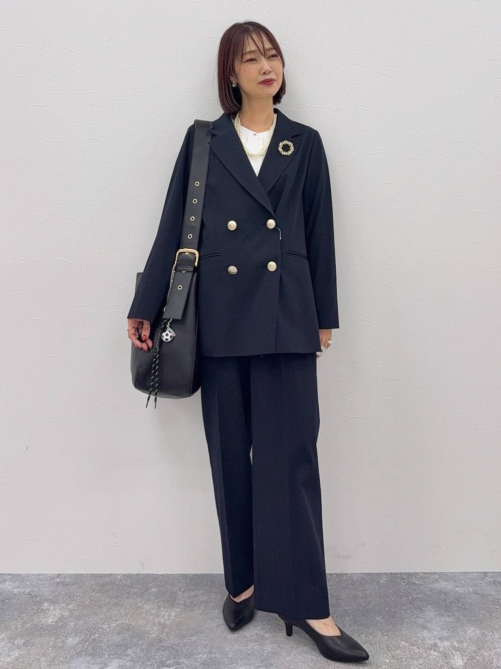 ▼詳しいサイズ感や着心地も記載しています▼ 卒業・入学コーデ ジャケットに同素材のワイドパンツを合わせてセットアップコーデにしました(^^) ダブルのゆったりしたデザインでこなれ感があります!普段のカジュアルコーデにも使えます! ワイドパンツだとカッコいい雰囲気に! ↓他のコーデ↓ 【着用サイズ】 ダブルジャケット→Mサイズ いつも通りで◎ ダブルのデザインでゆったりしたサイズ感です☆ 腰が隠れる長さで体型カバーできます! お洗濯も可能! ブラウス→Мサイズ いつも通りで◎ ボタンを外すとスキッパーデザインで使えます! パンツ→Mサイズ サンプル撮影のためMサイズ着用 いつものSサイズの方がスッキリ見えるので、キレイめに使うならSサイズを選びます! ウエスト後ろ側はゴムなので楽に履けます! 足のラインを拾わず体型カバー出来ます! パンツはややハイウエストのデザインでウエストインすると細見えします! センターラインもしっかり入っていて脚長効果あり! シューズ→Mサイズ LサイズだとパカパカするのでMサイズを選びました!やや大きめの作りです! ヒールが高過ぎず歩きやすいです!スタイルアップして見えます!