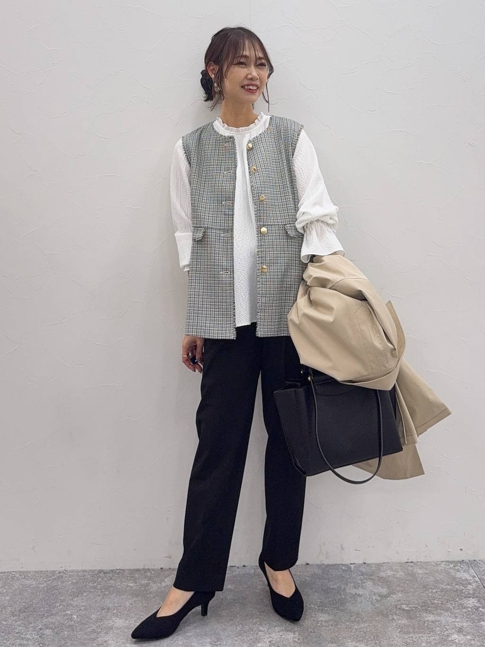 ▼詳しいサイズ感や着心地も記載しています▼ 卒業・入学コーデ ツイードジレにペプラムブラウスとテーパードパンツを合わせました(^^) ペプラムのジレはふんわりシルエットで可愛いです!硬くない素材で着心地も◎ テーパードパンツだと足元がスッキリ細見えします! インナーブラウスは襟元と袖口がひらひらで可愛いです! ↓他のコーデは↓ 【着用サイズ】 アウター→Mサイズ ゆったりしていてジャケットの上からでも羽織れます! 膝上丈で扱いやすいです! 少しパンとした張りのある素材でキチンと感もしっかり出ます! オンオフどちらにも◎ ジレ→Mサイズ いつも通りで◎ ツイード素材で上品な印象です! ウエストから広がるのでスッキリ細見え! 手洗いでお家でお洗濯可能です! ブラウス→Мサイズ いつも通りで◎ ややAラインのシルエットでインしなくても◎ テーパードパンツ→Sサイズ やや大きめの作りです! XSサイズも履けますがふくらはぎが気になるので、Sサイズを選びました! ウエストはゴムでとても楽な履き心地なのに綺麗なシルエットが出ます! タックのお陰で腰や太ももにゆとりがあり体型カバー出来て◎ 足首が少し見える丈感でスッキリ見えます! センターラインのお陰で脚長効果あり! シューズ→23.5サイズ ぴったりサイズの方が脱げにくかったので23.5を選びましたが、問題なく履けます! ヒールは高過ぎず歩きやすいです!
