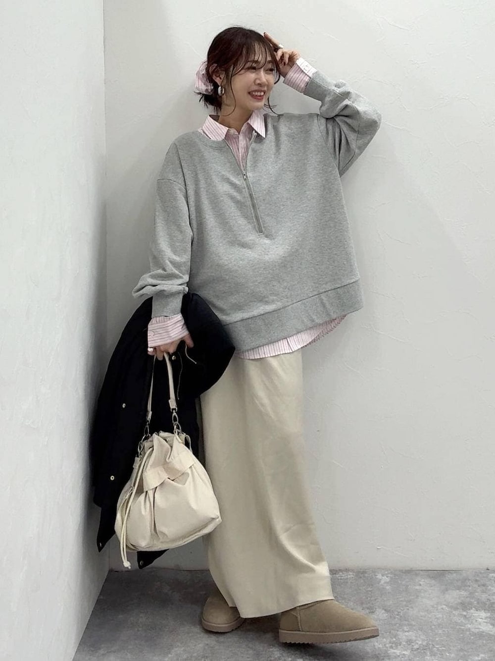 ▼詳しいサイズ感や着心地も記載しています▼ ハーフZIPスウェットにシャツとサテンスカートを合わせて女っぽカジュアルにしました(^^) スウェットは首の開きが広めて子供っぽくならないデザインです!ゆったり大きめでレイヤードもしやすい! アウターはデザイン性があるのにリアルダウンで機能的にも◎リブのデザインがオシャレ見え! 【着用サイズ】 アウター→Mサイズ ゆったりオーバーサイズです! 着丈長めで太ももまで隠れる長さです! リアルダウンですがモコモコし過ぎず着膨れしにくいです! ビックリするくらいとっても軽いです! ウエストで絞るとスタイルアップして見えます! スウェット→フリーサイズ ゆったり大きめです! 春まで着られる定番スウェット素材! ハーフZIPとロゴの前後2WAY! ZIPなのに広めのクルーでスッキリ見えます! シャツ→Mサイズ ゆったりしています! カジュアルにオーバーサイズで着たい方はワンサイズアップでも◎ 皺になりにくいのでお手入れ楽ちんです! スカート→フリーサイズ ウエストゴムで楽に履けます! ストンとしたシルエットで細見えします! オールシーズン使えます! ブーツ→Mサイズ 23.5〜24.0ですが、Mで問題なく履けました! とても軽くて歩きやすくて暖かいです!