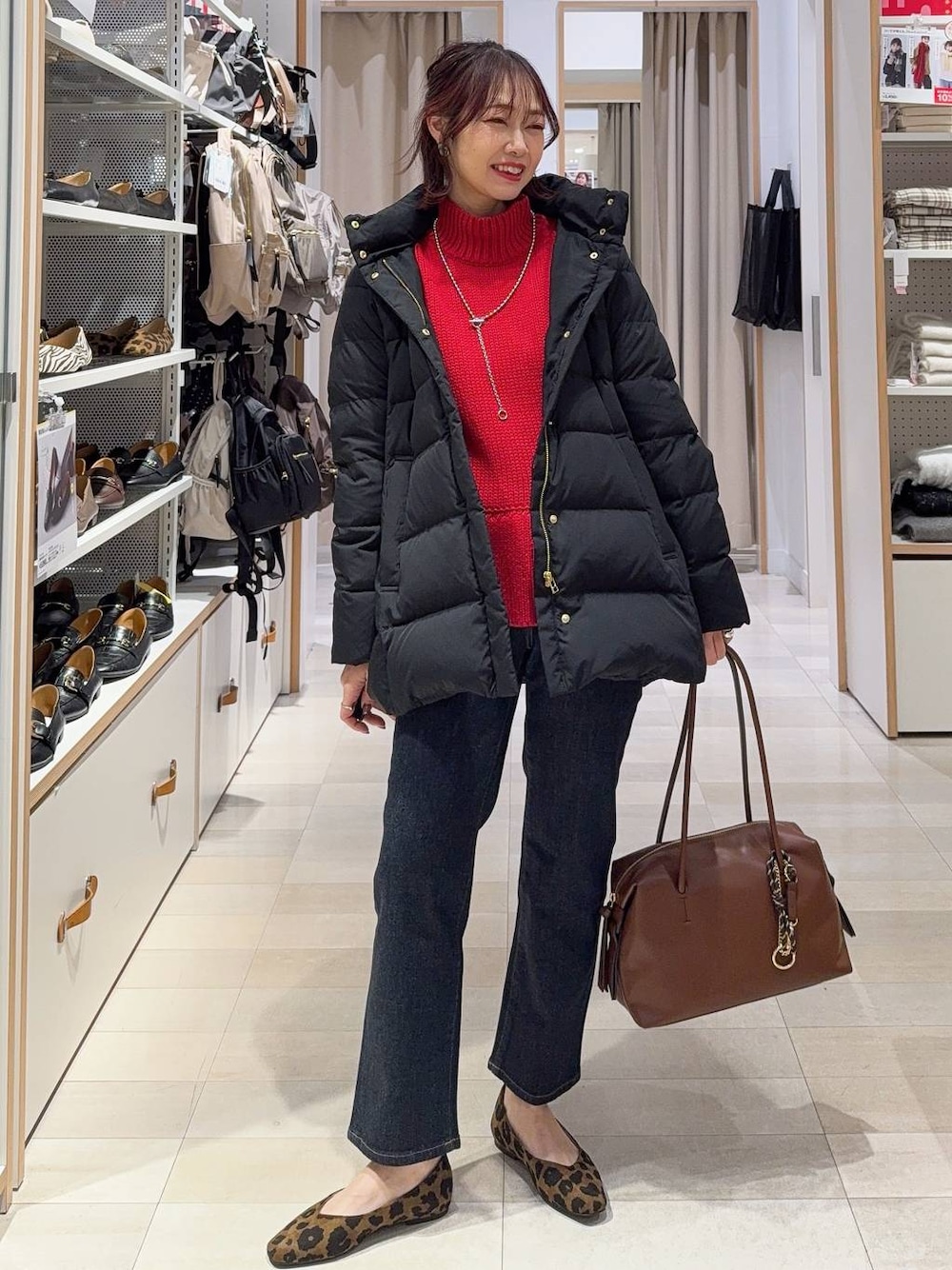 ▼詳しいサイズ感や着心地も記載しています▼ ペプラムニットにスリムデニムを合わせてキレイめカジュアルコーデにしました(^^) ニットは裾がペプラムになっていて可愛いです!シンプルなので合わせやすてポイントになります! スリムデニムはキレイめさんにオススメ!裾はピタっとしてないのでふくらはぎのラインも出ないです! アウターはウエストシェイプされていて細見えします! 【着用サイズ】 アウター→Mアウター いつも通りで◎ お尻までスッポリ隠れる長さです! リアルダウンで厚手なのでしっかり防寒出来ます! ウエストの内側にコードがついているので、ウエストをシャイプして着ることが出来ます! フードの内側がフェイクファーになっていてポイントになります! ニット→Mサイズ 程よくゆとりがあります! やや厚手の生地感で、チクチク感はなし! 裾がヒラヒラして可愛いです! デニム→Sサイズ スッキリ履きたかったのでSサイズにしました! ハイウエストデザインでお腹周り安心です! ストレッチがよく効いていて動きやすいです! 細めで真っ直ぐなシルエットなので脚長効果もあり! シューズ→Mサイズ LサイズだとカパカパするのでMサイズを選びました! クッションがきいていて歩きやすいです!