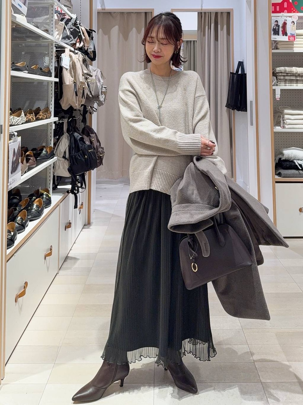 ▼詳しいサイズ感や着心地も記載しています▼ ニットとプリーツスカートのセットアップでキレイめコーデにしました(^^) セットで着るだけで可愛いコーデに♡ニットは裾が丸いシルエットで女性らしいです!スカートとチュールのプリーツでふわっと可愛いです! アウターは絶妙な着丈でゆったりなのにスッキリ見えます!オンオフ使えるデザインです! 【着用サイズ】 アウター→Mサイズ ゆったりオーバーサイズです! お尻がスッポリ隠れる長さです! 首元を閉めるとスタンドコート、開けるとピーコートとして使うことが出来ます! 肩の落ちたデザインなのでカチッとしすぎず、キレイめにもカジュアルにも使えます! ストレッチが効いているので肩や腕も動かしやすいです! ニット・スカートセット→Mサイズ いつも通りで◎ ニットはウエストが隠れる短め丈でスッキリ着られます! 裾が丸いシルエットが可愛いです! 柔らかくて肌触りもいいです! スカートはウエストゴムで楽ちん! シューズ→Mサイズ Lサイズだと大きかったのでMサイズを選びました! ピンヒールですが高過ぎないので歩きやすいです! 足が綺麗に見えます!