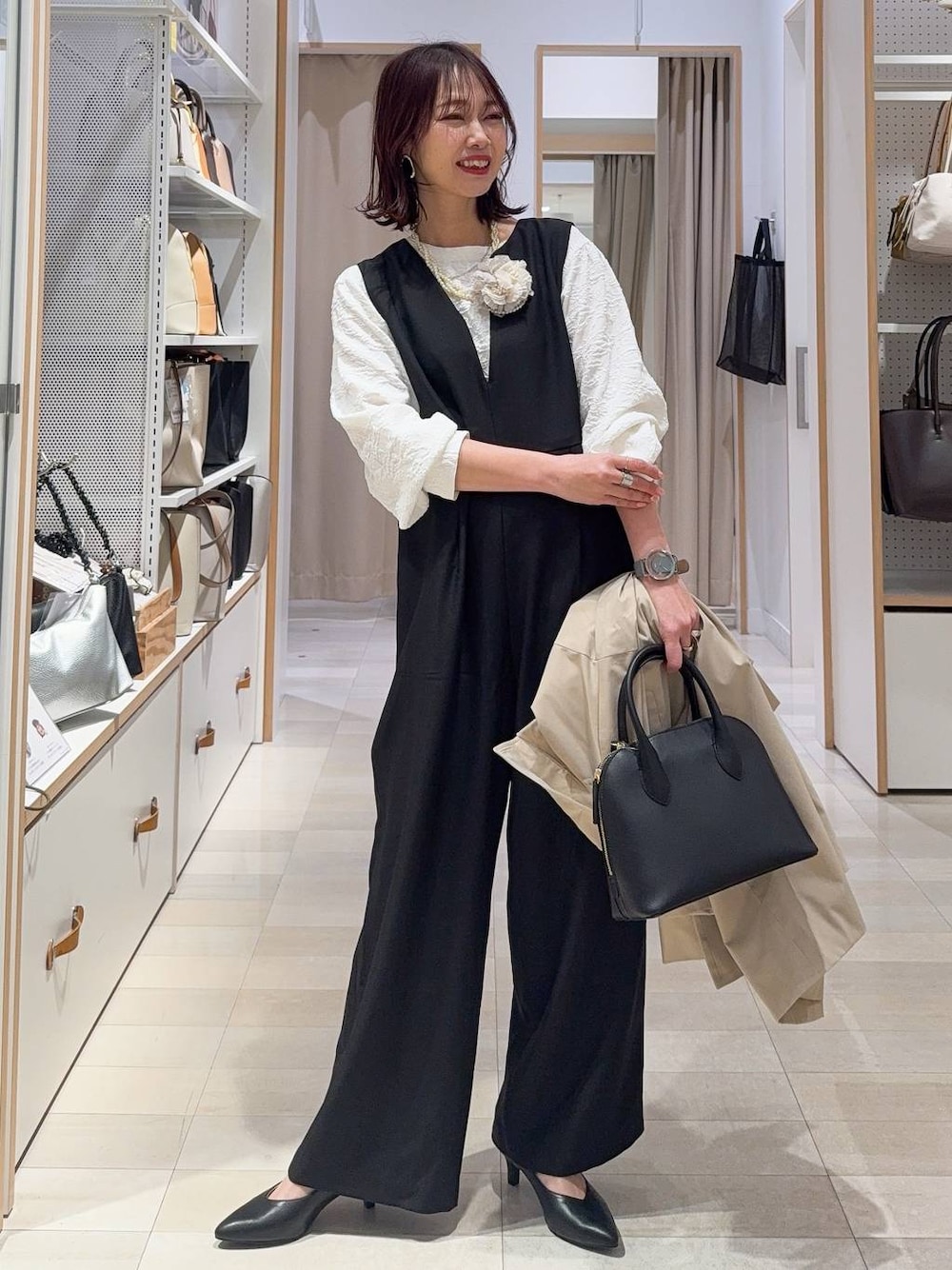 ▼詳しいサイズ感や着心地も記載しています▼ 卒業・入学コーデ キレイめサロペットで上品コーデにしました(^^) サロペットはキーネックデザインなので上品さもあるデザインです!もちろん普段使いにも◎ ブラウスはジャガード素材で高見え!透け感もないので下にインナーを着やすいです! スプリングコートはサッと羽織りやすいミドル丈でカジュアルにも着回し出来ます! ↓他のコーデは↓ 【着用サイズ】 アウター→Mサイズ ゆったりしていてジャケットの上からでも羽織れます! 膝上丈で扱いやすいです! 少しパンとした張りのある素材でキチンと感もしっかり出ます! オンオフどちらにも◎ ブラウス→Mサイズ いつも通りで◎ ジャガード素材で高見え! 白でも透け感はほとんどないです! 前後2WAY、羽織りとしても◎ 袖口ゴム入り! サロペット→Mサイズ いつも通りで◎ ピタッとしないので体型を拾わず楽な着心地! ブラックとチャコールはキレイめ感のある素材で春から秋まで長く使えます! シューズ→23.5サイズ 普段23.5〜24.0ですがちょうど良いです! ヒールが高過ぎず歩きやすいです!スタイルアップして見えます!