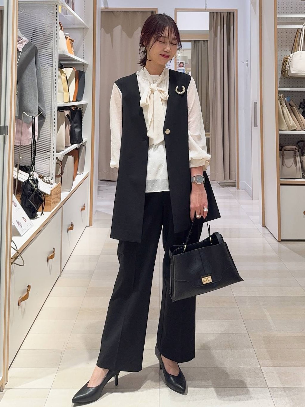 ▼詳しいサイズ感や着心地も記載しています▼ 入学式コーデ ジレと同素材のワイドパンツを合わせました(^^) 普通のオケージョンコーデは苦手という方にオススメ!オシャレ見えだけでなく、腰回りも隠れて体型カバーにも◎ ボウタイブラウスはポイントになって可愛いです!リボンが垂れる素材なので甘くなり過ぎないけれどしっかり華やかに! ↓他のコーデは↓ 【着用サイズ】 ジレ→レギュラーサイズ お尻が隠れる長さです! 肩の落ちないデザインでキチンと感あり! 同素材のウツクシルエットシリーズとセットアップとして着用できます! 裏地無しでサラッと羽織りやすいです! ブラウス→Mサイズ いつも通りで◎ 袖透け感あります! 柔らかくて着心地◎ ボウタイは取り外し可能です! パンツ→Sサイズ スッキリ履きたかったのでSサイズを選びました! カジュアル使いならMサイズでも◎ ウエスト後ろ側はゴムなので楽に履けます! 足のラインを拾わず体型カバー出来ます! パンツはややハイウエストのデザインでウエストインすると細見えします! センターラインもしっかり入っていて脚長効果あり! シューズ→Mサイズ いつも通りのサイズで大丈夫です! 高めヒールだけどクッションが効いていて歩きやすいです!