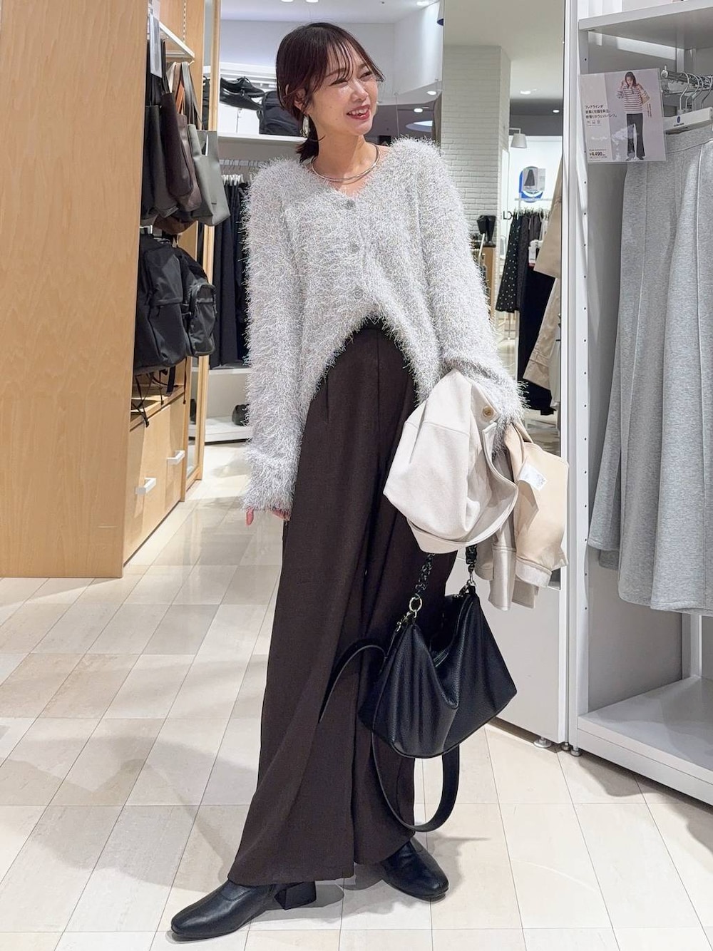 ▼詳しいサイズ感や着心地も記載しています▼ シャギーカーデにワイドパンツを合わせてキレイめコーデにしました(^^) カーディガンはふさふさなのにストンとしてくれるので、着膨れ感なし!柔らかくて着心地も◎お尻もスッポリ隠れます! ブラウンパンツなら重たくなり過ぎずこなれ感もバッチリ! 【着用サイズ】 シャツジャケット→Mサイズ ゆったりしています! 少し肉厚な柔らかい素材で羽織りにはもちろん、シャツ風にも着られます! カーディガン→Mサイズ いつも通りで◎ お尻まで隠れる長さです! シャギーですがストンと落ち感があるので着膨れしづらいです!サラサラとした素材で暖かくなっても使えます! パンツ→Mサイズ ゆったりしています! ウエスト後ろはゴムで楽ちんです! 太めのシルエットで足のラインを拾いません! サラッとした厚手過ぎない生地感で長い期間使えそうです! シューズ→Lサイズ Mサイズでも履けますが、厚手の靴下も履きたいのでLサイズを選びました! 軽くてしっかりしているので歩きやすいです!