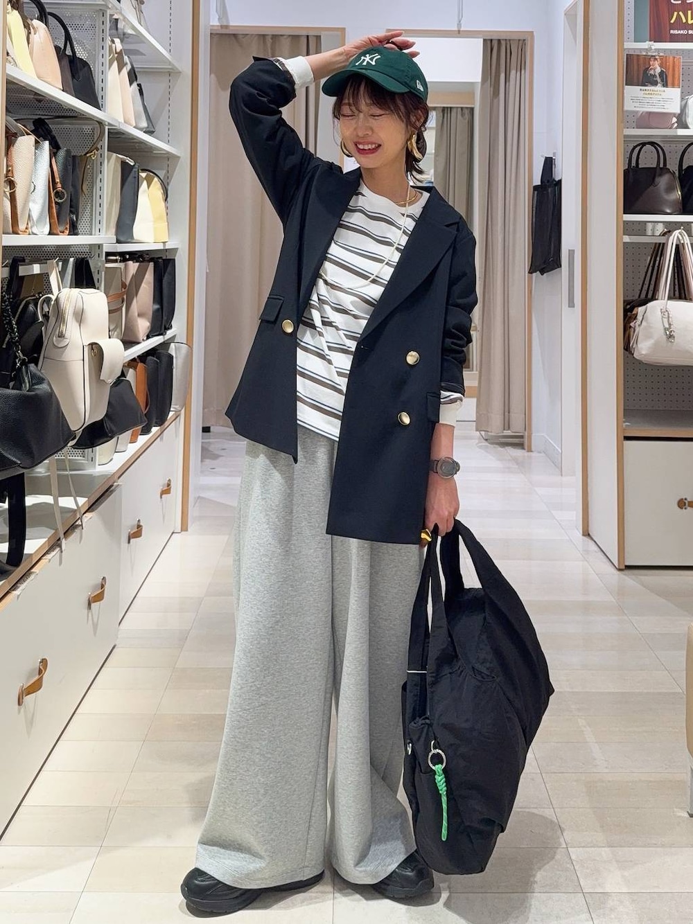 ▼詳しいサイズ感や着心地も記載しています▼ ジャケットにスウェットパンツを合わせて大人カジュアルコーデにしました(^^) ダブルのジャケットはカジュアルにも◎ゆったりだからパーカーやスウェットの上からも着られます! ボーダーTはブラウンとブルーのカラーがポイントに! スウェットパンツはツルッとした素材でキレイ見えします! ジャケットはもちろんオケージョンやお仕事にも! 【着用サイズ】 ダブルジャケット→Mサイズ いつも通りで◎ ダブルのデザインでゆったりしたサイズ感です☆ 腰が隠れる長さで体型カバーできます! お洗濯も可能! Tシャツ→Mサイズ ゆったり大きめです! 袖口にリブが付いていて腕捲りもしやすいです! パンツ→Mサイズ ゆったり太めのシルエットです! ウエストはゴムで楽ちん! ツルッとしたハリのある素材で綺麗見えします! ポケットも付いています! スニーカー→Lサイズ 靴下も履くことを考えると23.5〜24.0の私はLサイズがジャストでした!