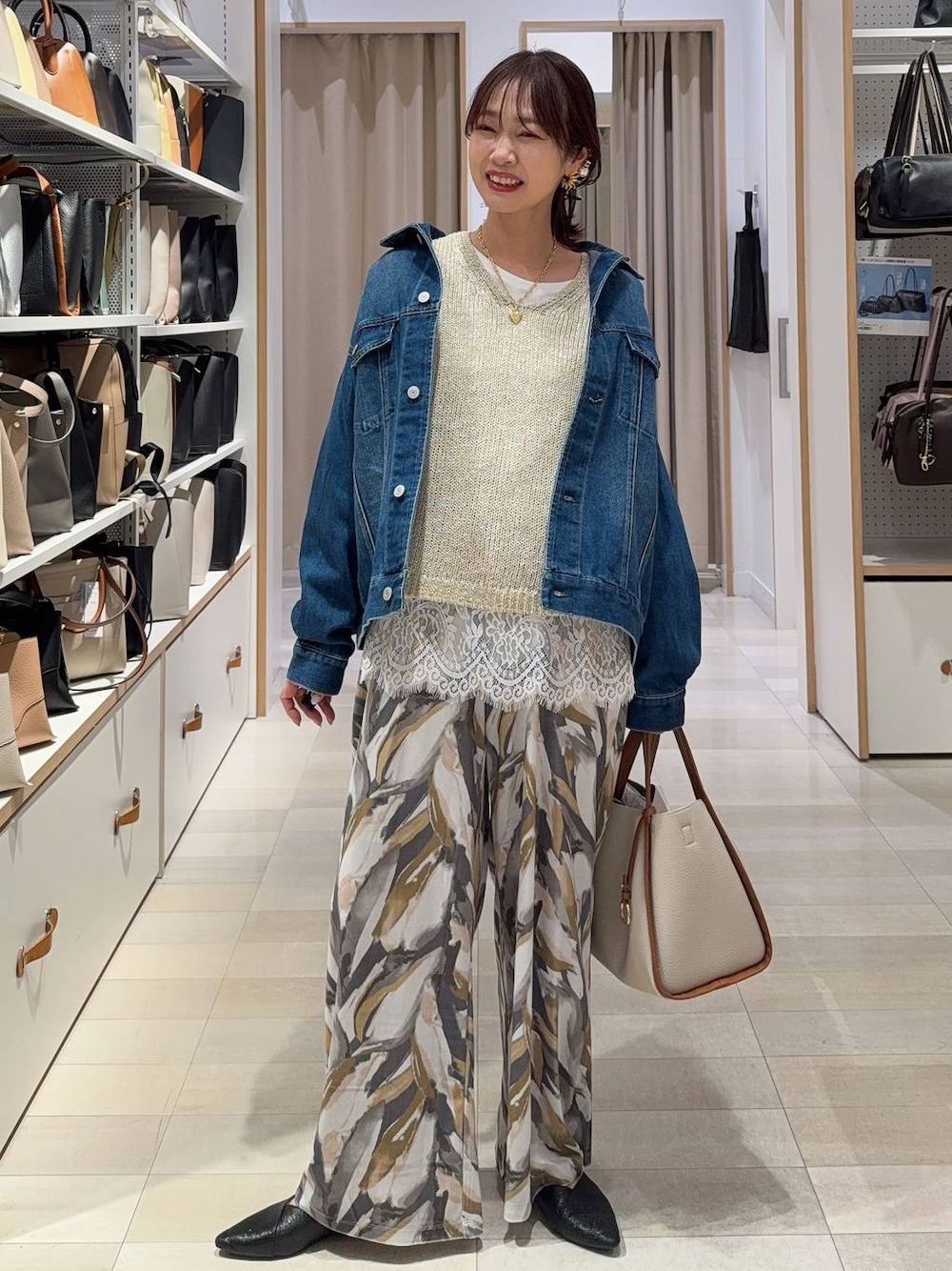 ▼詳しいサイズ感や着心地も記載しています▼ メッシュニットに柄パンツを合わせて大人カジュアルコーデにしました(^^) ニットはざっくり編まれていて少し透け感があるので一枚でオシャレ見え!レースのレイヤードインナーを重ねてトレンド感をプラス! パンツは薄手のベロア素材でオシャレ見え! デニムジャケットは柔らかくてとっても着やすいです!定番デザインなので一枚あると使えます! 【着用サイズ】 デニムジャケット→Lサイズ 元々ゆったりですがオーバーサイズで着たかったのでLを選びました! ゆったりトップスの上からも問題なく羽織れます! お尻がしっかり隠れる長さです! デニム素材ですが固くなく動きやすいです! トップス→Mサイズ ゆったりしています! ストンとしたシルエットで着膨れしません! 網目がざっくりしていてメッシュになっています! リネン混ですがザラザラ感はあまり気になりません! タンクトップ→Mサイズ お尻が隠れる長さです! パンツ→Mサイズ いつも通りで◎ ウエストはゴムで楽ちんです! 足のラインを拾わず体型カバーできます! シューズ→Mサイズ LサイズだとカパカパするのでMサイズを選びました! クッションが効いていて歩きやすいです!