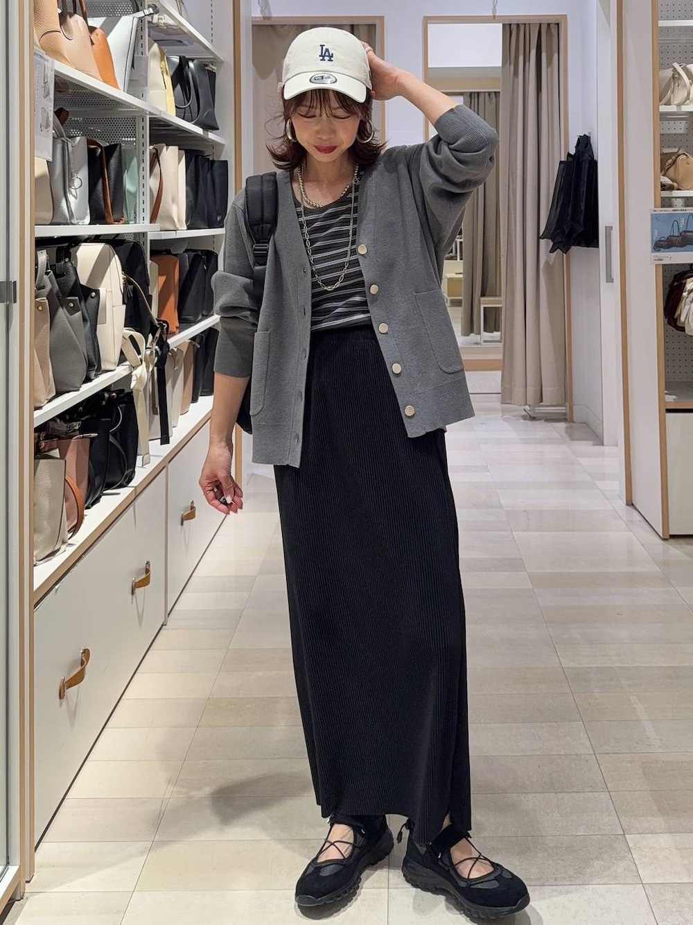 ▼詳しいサイズ感や着心地も記載しています▼ VカーディガンにIラインスカートを合わせてカジュアルコーデにしました(^^) カーディガンは程よい厚みでサラサラしていて着心地抜群!オンオフどちらも使えます! スカートはプリーツだから動きやすさも◎スッキリスタイルアップして見えます! 【着用サイズ】 カーディガン→Mサイズ ゆったりしています! 腰にかかる長さです! 程良い厚みの素材でチクチク感もなく肌触り◎ 長い期間使えそうです! オンオフどちらにも◎ インナー→Mサイズ いつも通りで◎ スカート→レギュラーサイズ ウエストはゴムで楽ちんです! ピタッとしないのでお尻のラインも響きにくいです! 細いプリーツなのでよく伸びて動きやすいです! シューズ→Mサイズ やや大きめの作りなのでMで問題なく履けました! 軽くて歩きやすいです!