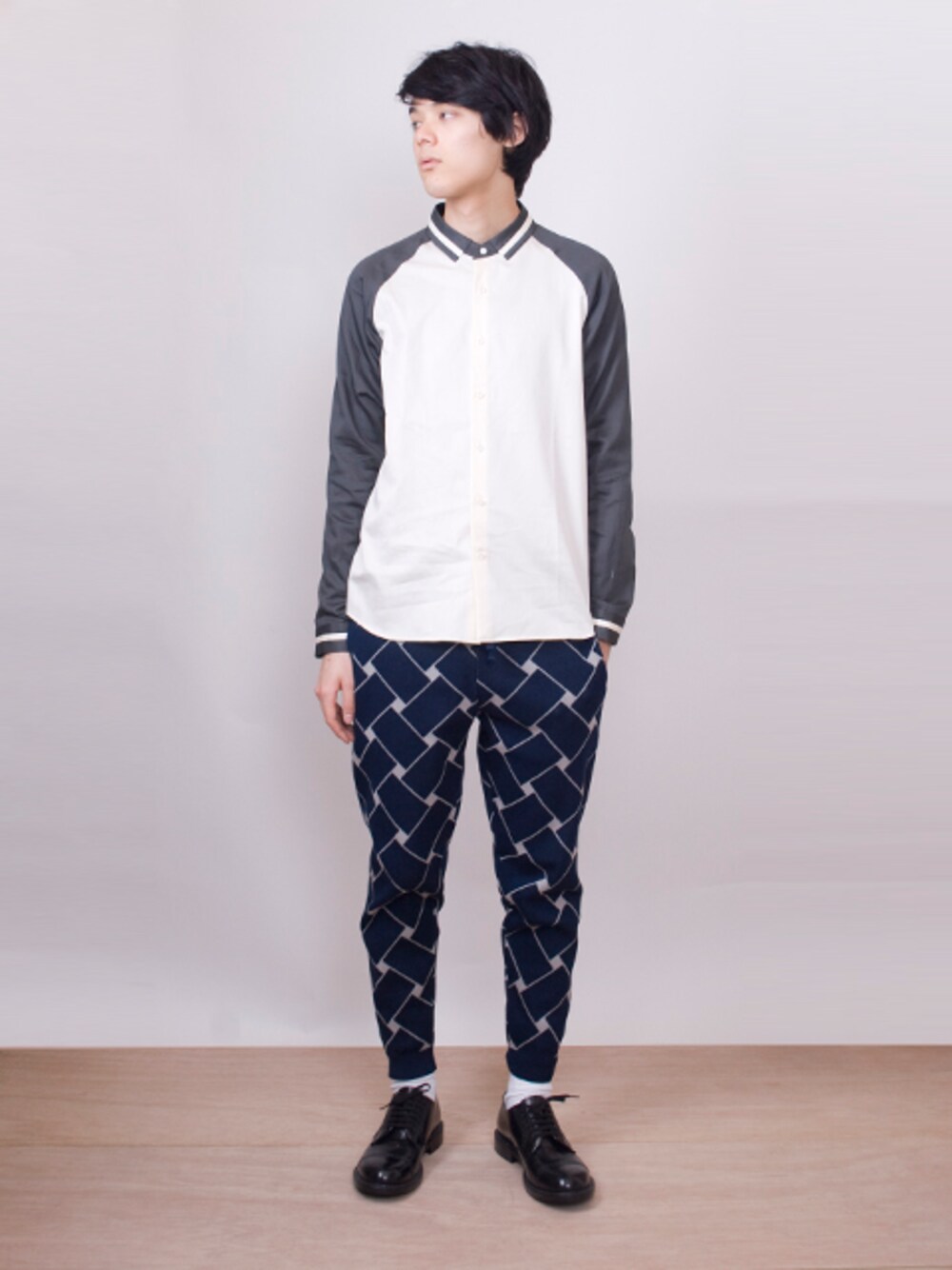 ・ETHOSENS スタジャン風切替シャツ ¥25920 ・ETHOSENS テーパードニットパンツ ¥28080 ・KIDS LOVE GAITE ガラスレザーストレートチップシューズ ¥47520