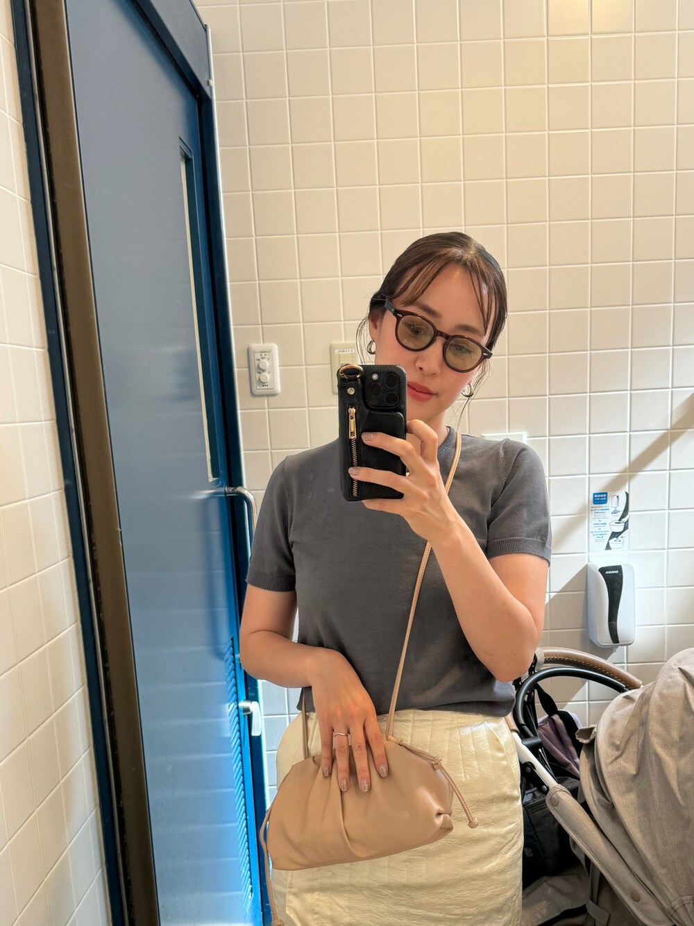 シンプルなニットTに光沢のあるスカート合わせな日🤍