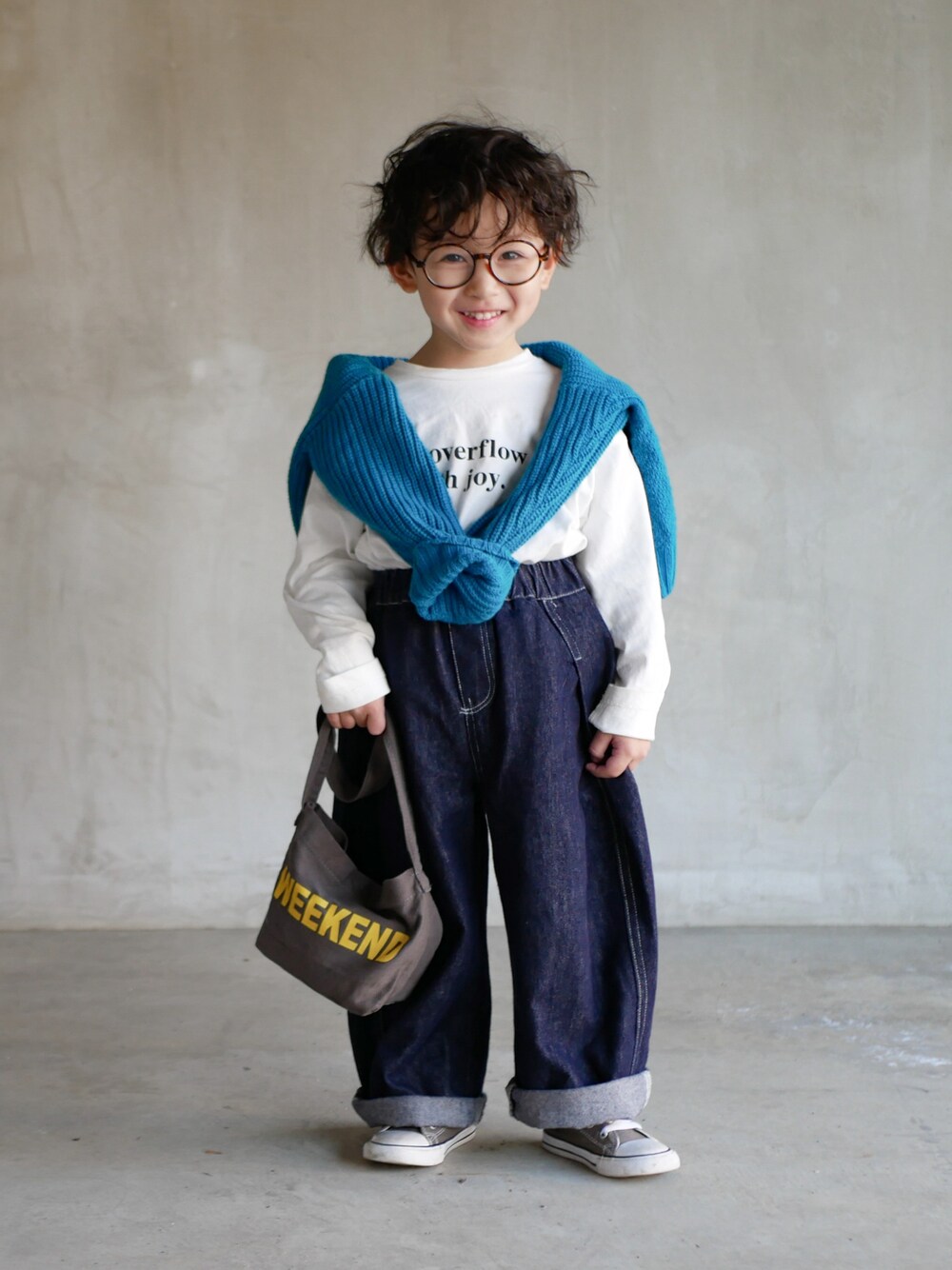 おしゃれフォントのロゴが可愛い🫰🏻🫰🏻🎧 レイヤードとしてもよく使ってます⸝⸝ 全体的に色合いが寂しかったので ブルーニットを肩掛けで差し色🩵 このニットサイズアウトしたけど小物で使える◎ 最近息子のなかで👓ブームがきており 常にそうちゃくしてます🤭⸒⸒ これはプチプラの西松屋🐰