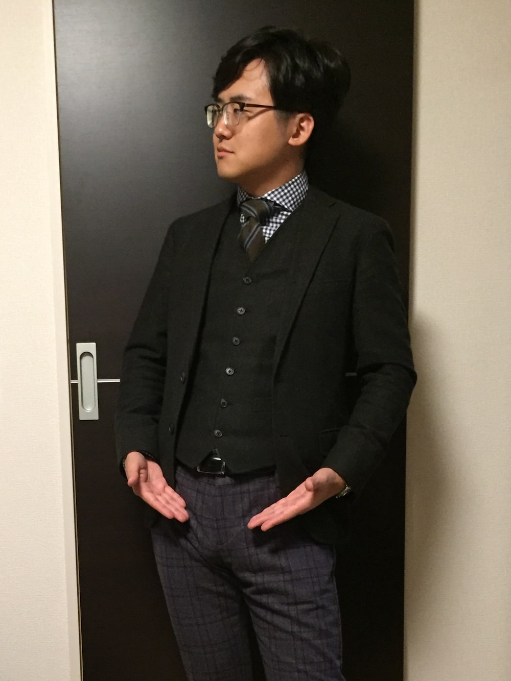 上下に違う種類のチェックを入れますが、上は渋めのベスト、ジャケットと、ネクタイで決めます。