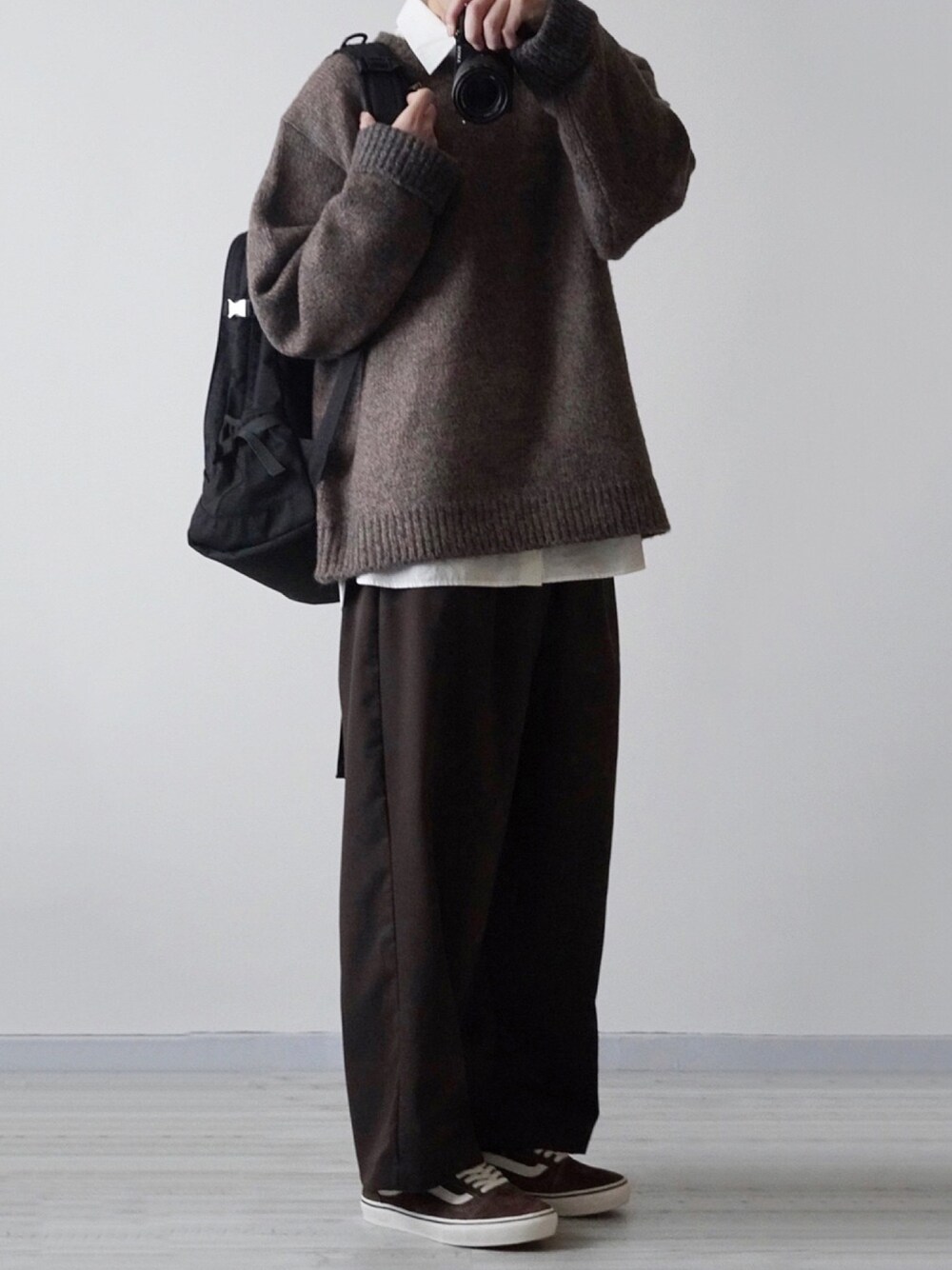 ニット×ワイドパンツ☺️ ブラウンアイテム多めの春コーデです❗️ 白シャツがブラウンをより引き立たせてくれます👍 学生さんにオススメのコーデです😆 Instagram→@sei_wearでは GU UNIQLO 話題のアイテムを紹介しています! よかったら見て下さい😆