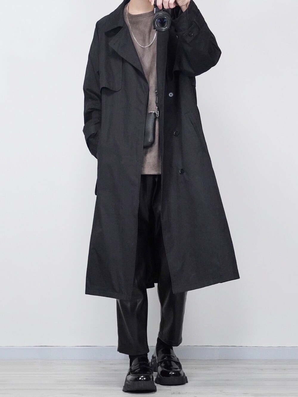 コート×レザーパンツ😎 久々にコートを着用しました❗️ 黒コートたまらなくカッコいいです🥰 最近暖かかったり肌寒かったり大変ですね😅 Instagram→@sei_wearでは モノトーン中心で様々なコーデを紹介してます! よかったら見て下さい😆