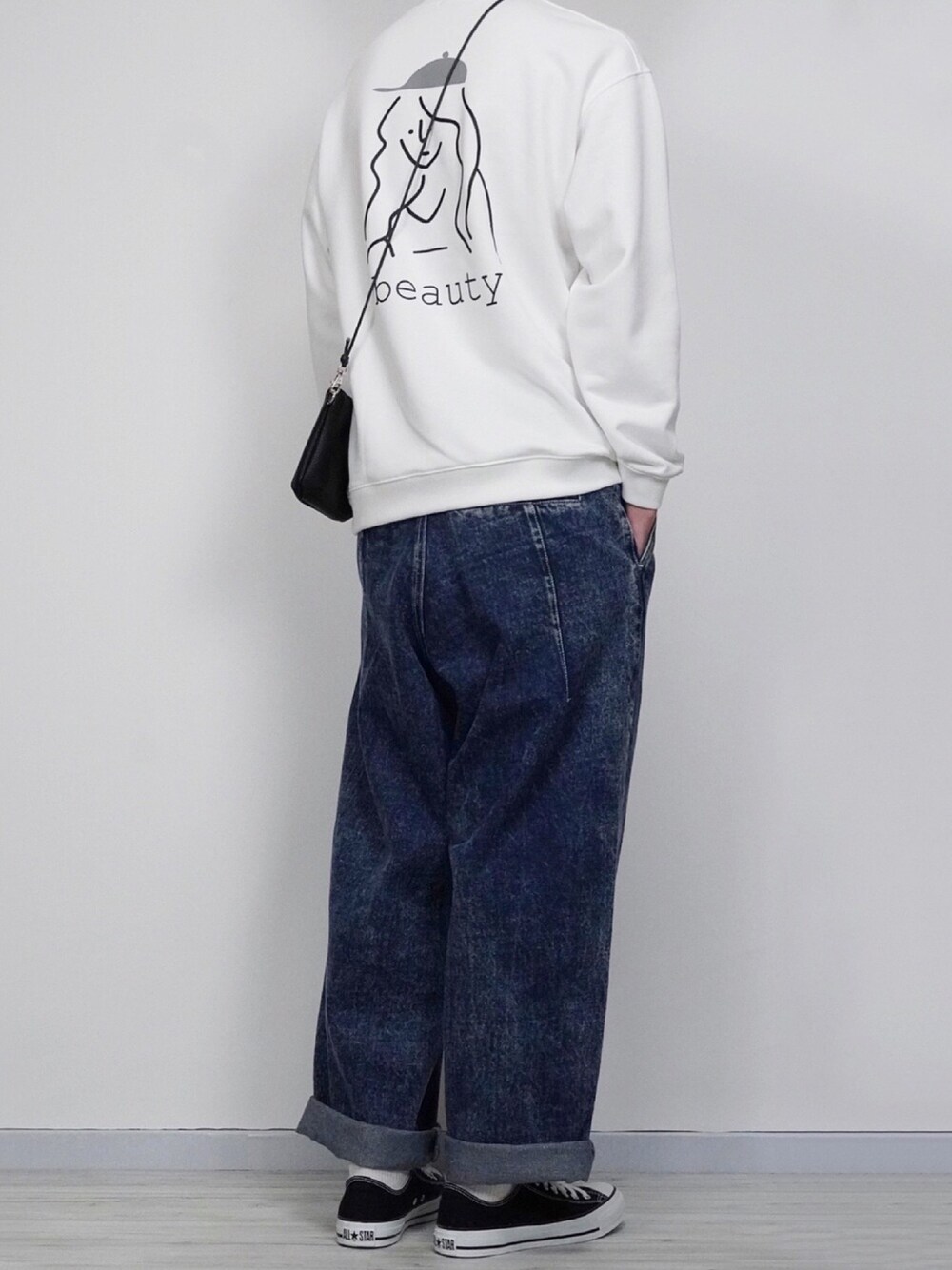 スウェット×ワイドデニム🔥 白黒青のシンプルコーデ❗️ この3色は本当に合わせやすいです🙌 バックプリントがとにかく可愛いすぎます😊 Instagram→@sei_wearでは モノトーン中心で様々なコーデを紹介してます! よかったら見て下さい😆