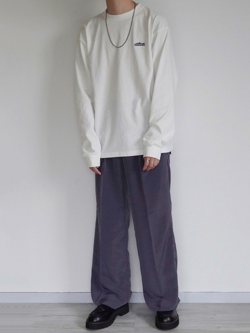 ホワイト×パープル THOUSAND MILEのロンT着用 シンプルなワンポイント刺繍のデザインでとても使いやすいです👌 今回はパープルのパンツと合わせて落ち着いた雰囲気にしてみました🙆♂️ Instagram→@sei_wearでは モノトーン中心で様々なコーデを紹介してます! よかったら見て下さい😆