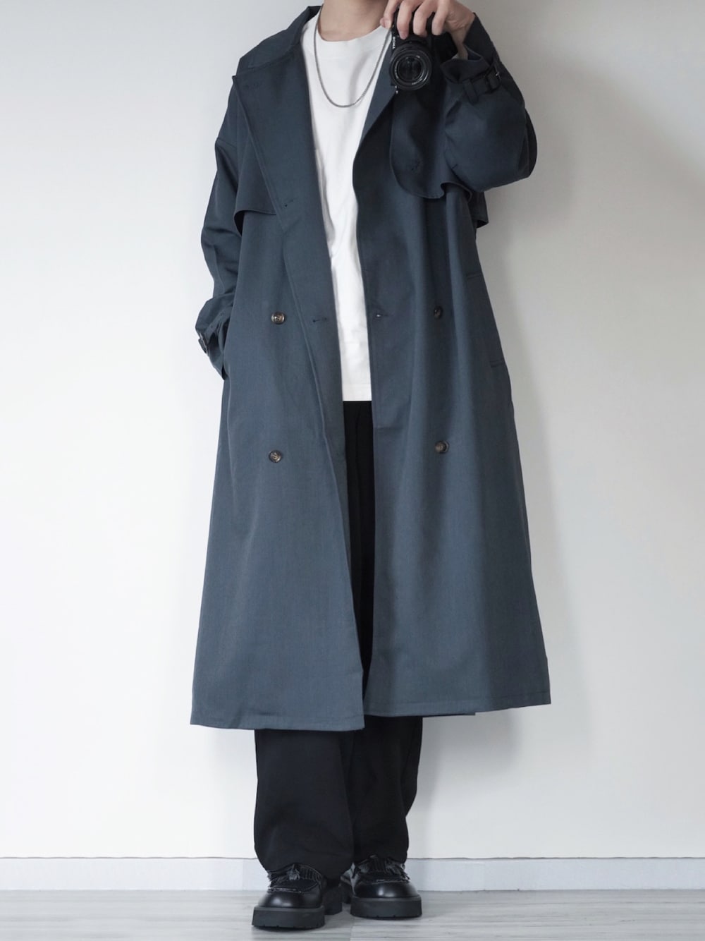 キレイめコーデ トレンチコートを使ってシンプルめに👌 outer: EMMA CLOTHES 22SS新作コート ゆとりのあるオーバーサイズシルエット ベルトを閉めれば違ったシルエットが楽しめます🙆♂️ ブルーチャコールのくすんだ色味がとても可愛いです✌️ _________________________________ Instagram →@sei_wearでは モノトーン中心で様々なコーデを紹介してます! よかったら見て下さい😆