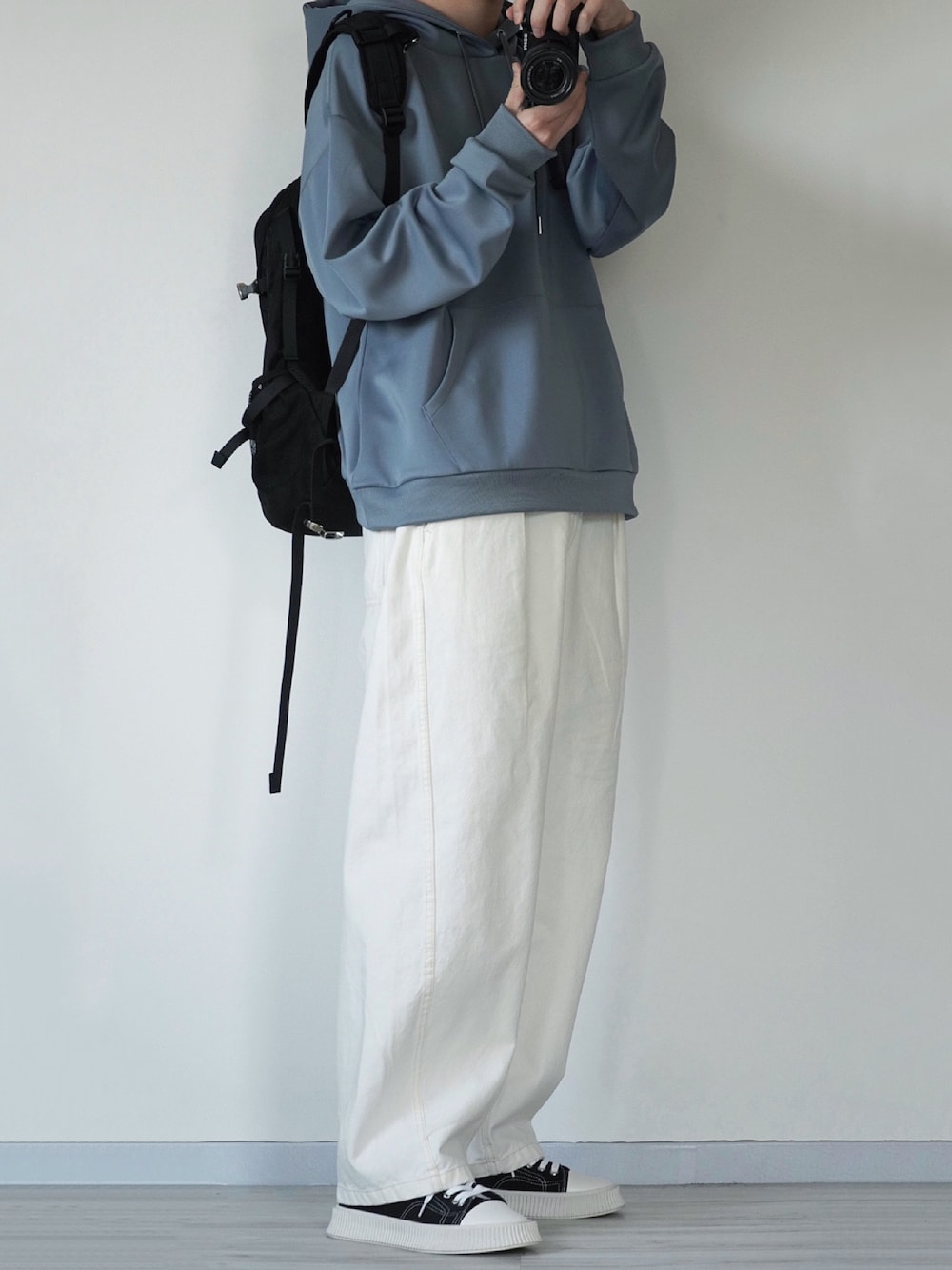 パーカー×ワイドパンツ くすみブルーは春にぴったり👌 白パンツと合わせるのがおすすめです🙆♂️ Instagram→@sei_wear