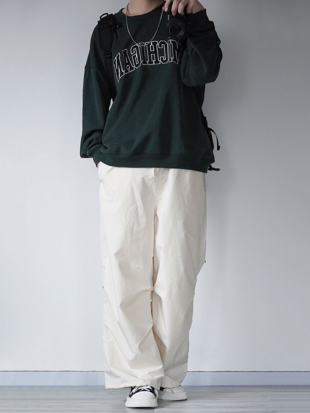 カジュアルコーデ グリーンとホワイトで春っぽく👌 ゆったりしたシルエットが春にぴったり🙆♂️ ロゴスウェットは1枚でもきまるおすすめアイテムです!! Instagram→@sei_wear
