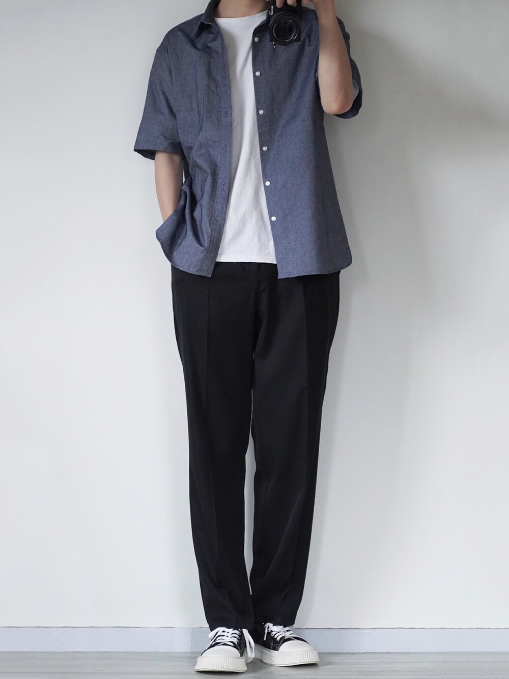 シャツ×スラックス シャツと黒スラックスを合わせたシンプルコーデ✌️ 抗菌、防臭のシャツなのでガシガシ着回せます👌 Instagram→@sei_wear