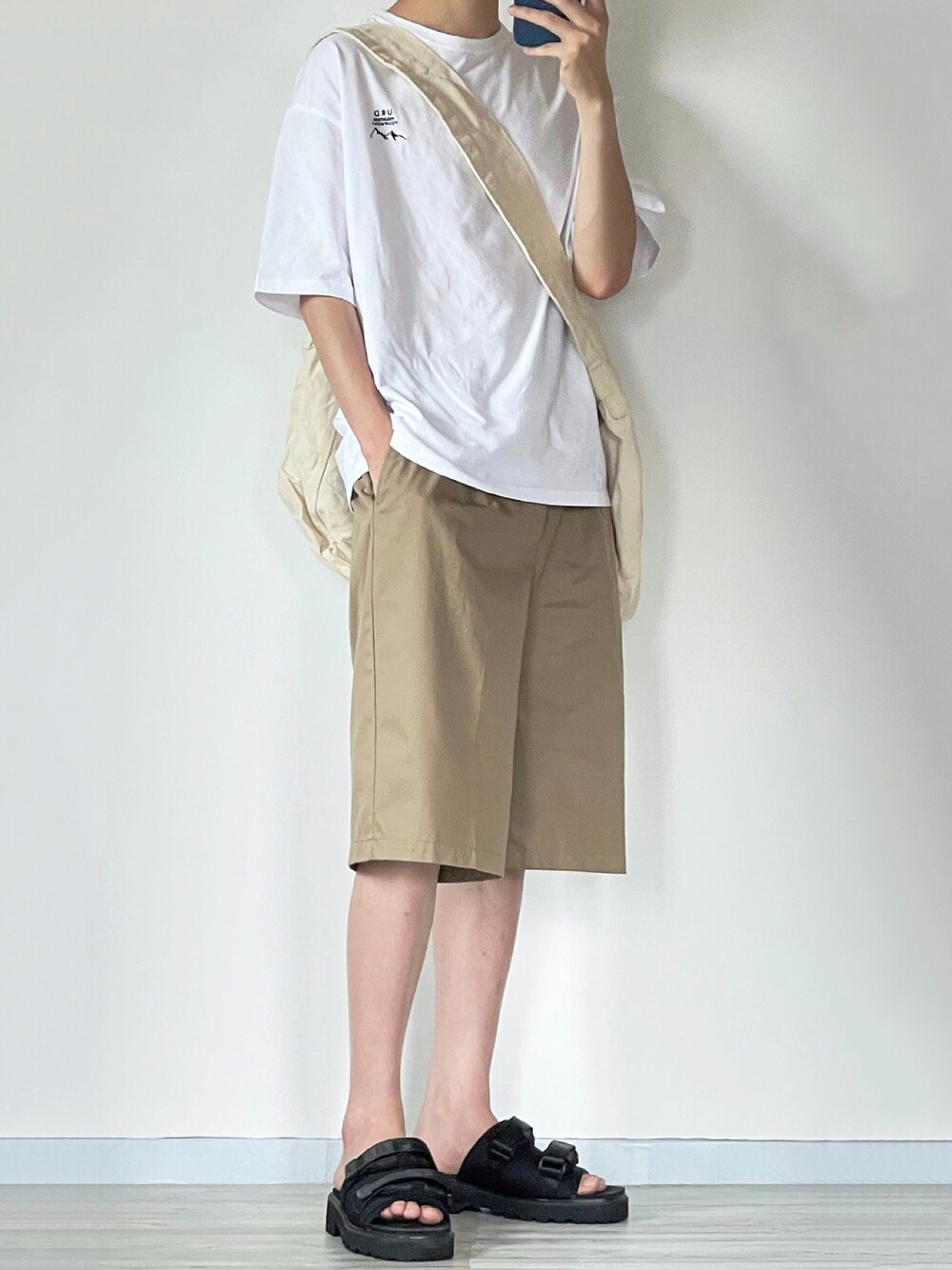夏コーデ 白T×ハーフパンツ 真夏にぴったりのシンプルコーデです👌 Tシャツのワンポイントがいいアクセントに✌️ Instagram→@sei_wear