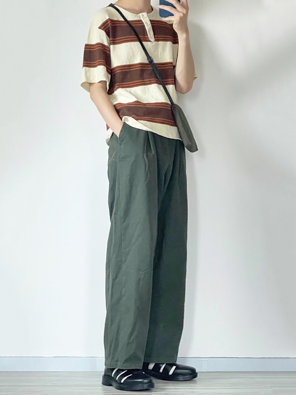 ブラウン×カーキ ボーダーTとワイドパンツを合わせてカジュアルに✌️ グルカサンダルで足元にアクセントを🙆♂️ ゆるいシルエットが良きです👌 Instagram→@sei_wear