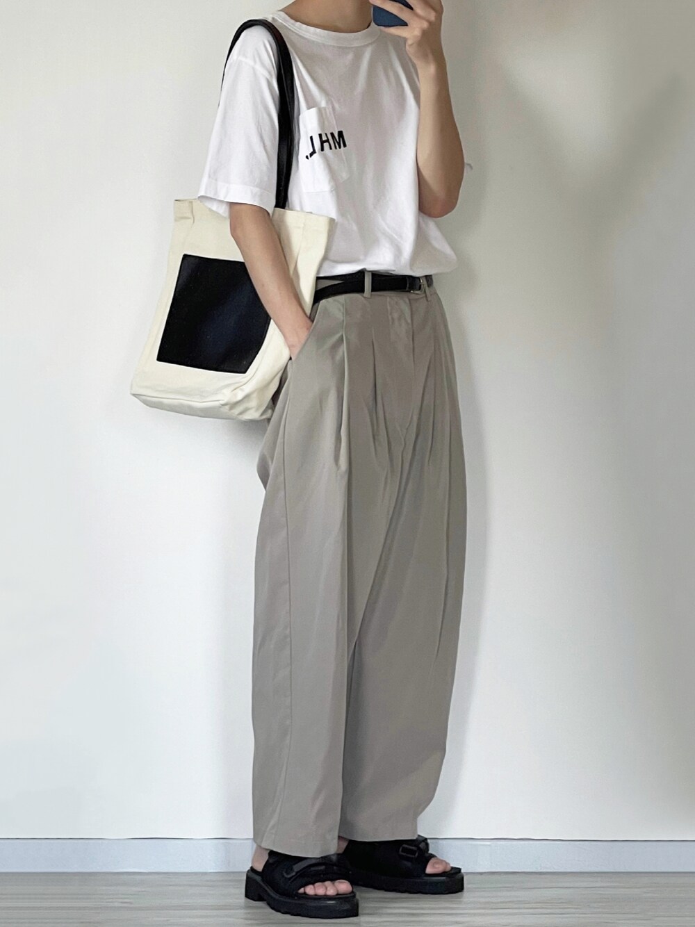 ホワイト×ベージュ 白Tをタックインしたゆるめのコーデ✌️ MHL.のTシャツが可愛すぎる。。。 Instagram→@sei_wear