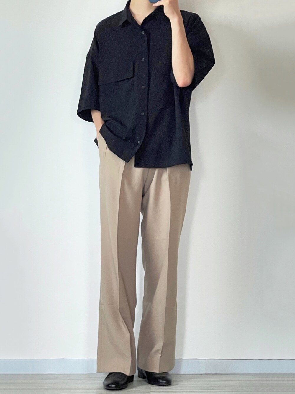 ブラック×ベージュ シンプルにシャツとスラックスを合わせたきれいめコーデ✌️ ASCLOのスラックスはスタイルが良く見えるからおすすめです!! 細すぎず太すぎないサイズ感が良すぎます👌 Instagram→@sei_wear
