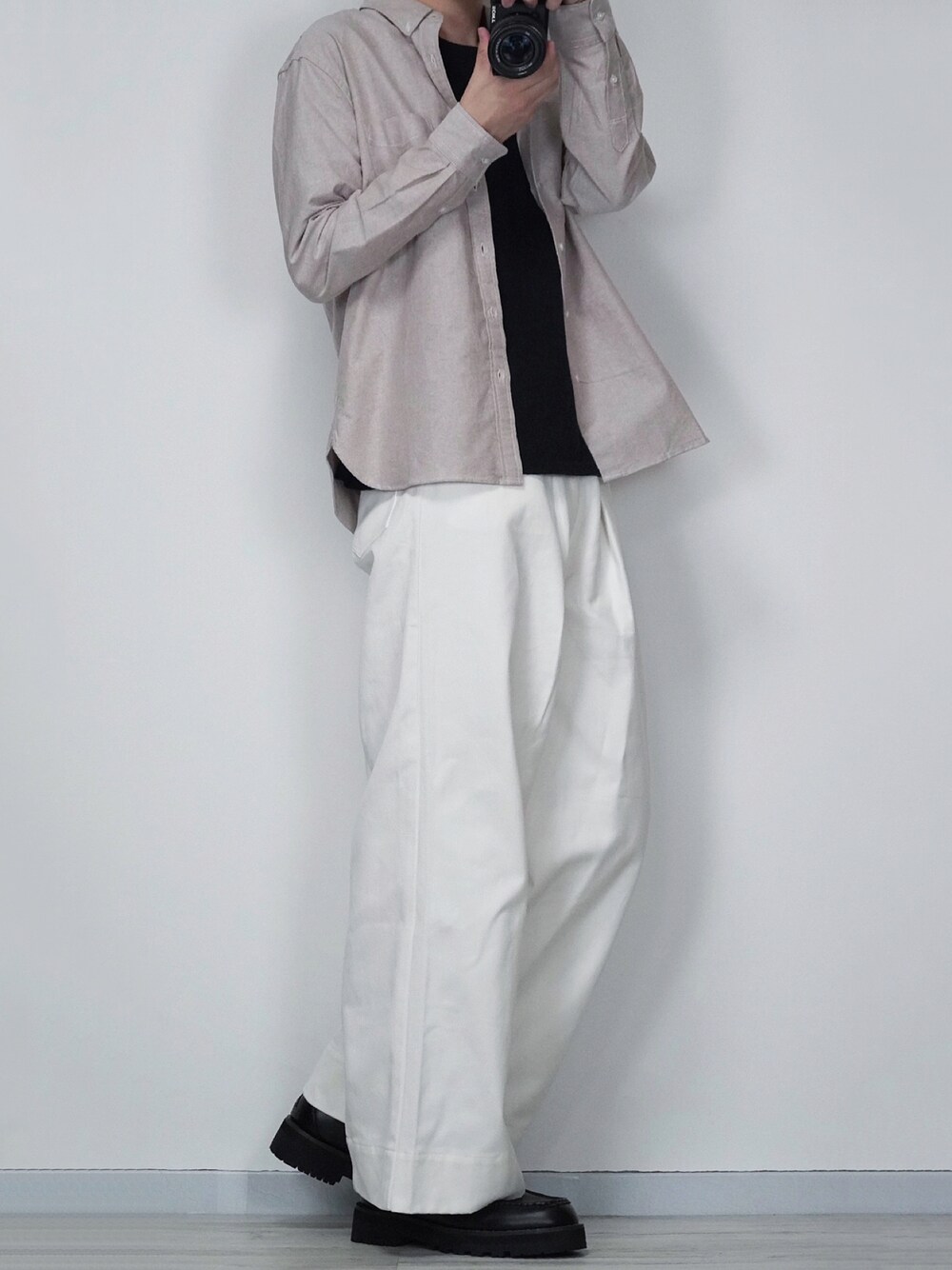 キレイめコーデ シャツと白パンツを合わせて清潔感のあるコーデに✌️ このパンツシルエットがキレイすぎてお気に入りです😆 Instagram→@sei_wear