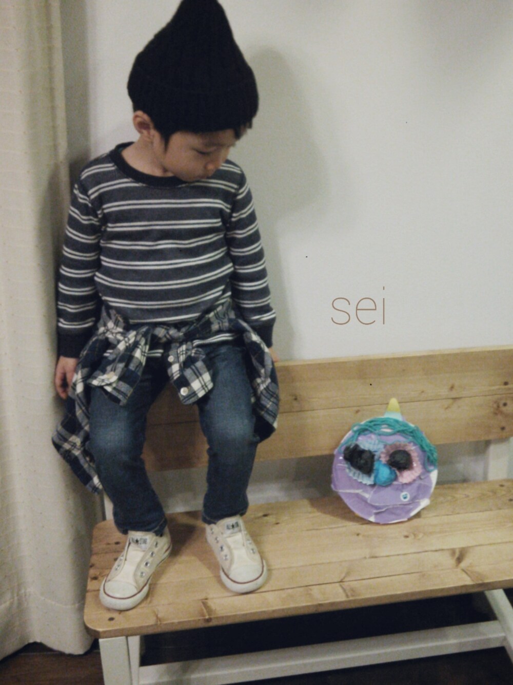 昨日の保育園コーデ。allにしまつや~😌 ようやく、ツーショット!!!!と思ったら ニット帽投げ捨て、自作のおめん。小窓に、、、 保育園では、大泣きした二人も パパ鬼には勢いよく豆を投げつけてました♪